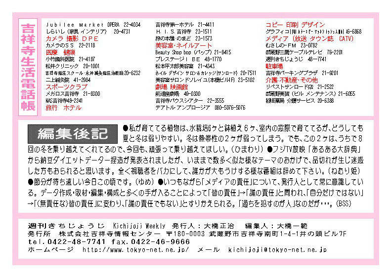 今週号インデックス 週刊きちじょうじトップページへ 東京ネットホームページへ