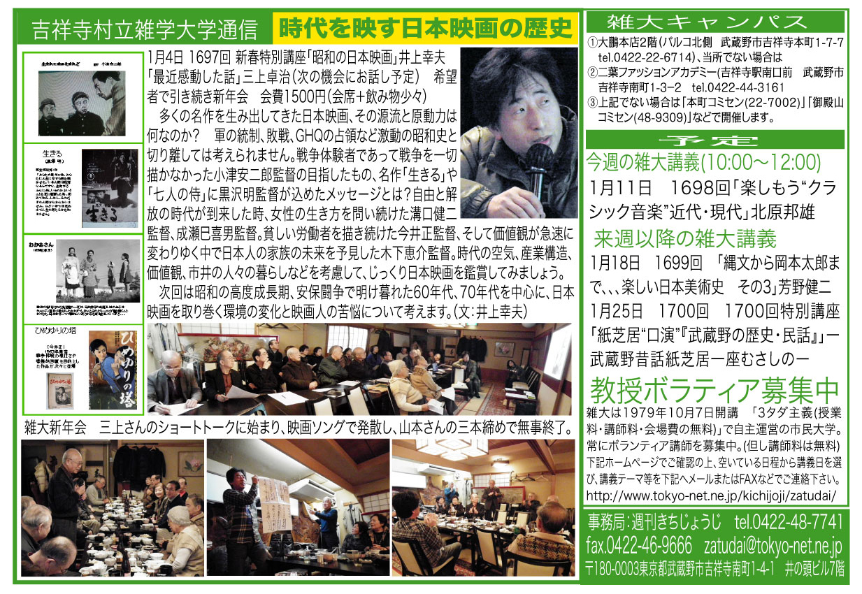 | 1月4日 1697回 | 新春特別講座 「昭和の日本映画」 井上幸夫 「最近感動した話」 三上卓治 希望者は引き続き新年会 会費1500円(会席+飲み物少々) |
