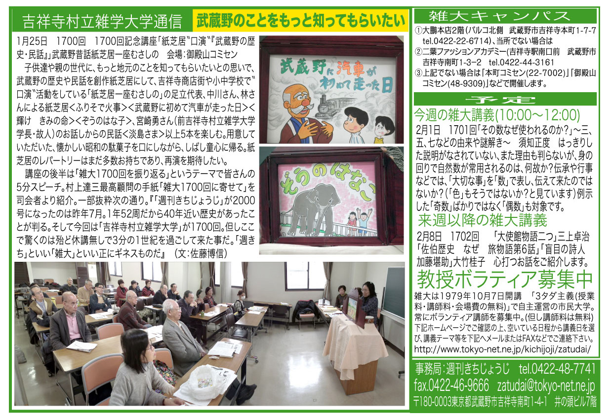 1700回特別講座「紙芝居“口演”『武蔵野の歴史・民話』」ー武蔵野昔話紙芝居一座むさしのー 子供たちや親の世代に、もっと地元のことを知ってもらいたいとの思いで、武蔵野の歴史や民話を創作紙芝居にして、吉祥寺の商店街や小中学校などで“口演”しています。<月の国むさしのボーイ><ふりそで火事><淡島さま>ほか 会場:御殿山コミセン第2会議室 |