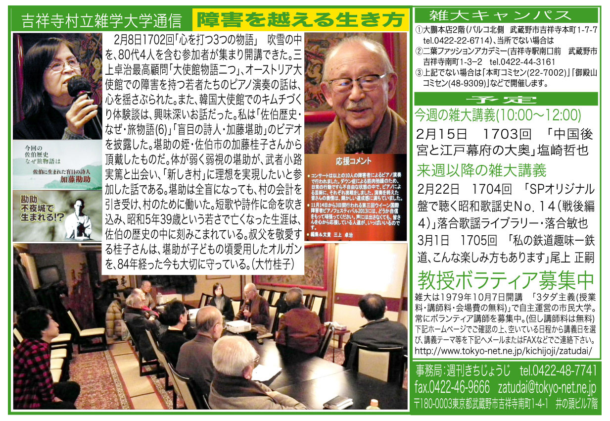 | 2月8日 1702回 | 「大使館物語二つ」三上卓治 「佐伯歴史 なぜ 旅物語第6話」「盲目の詩人 加藤堪助」大竹桂子 心打つお話をご紹介します。 |