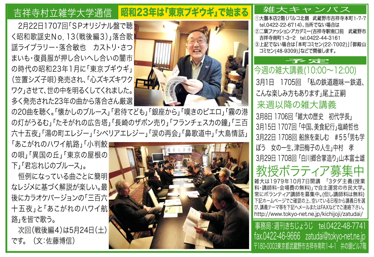 | 2月22日 1704回 | 「SPオリジナル盤で聴く昭和歌謡史No.14(戦後-3)」落合歌謡ライブラリー・落合敏也 |