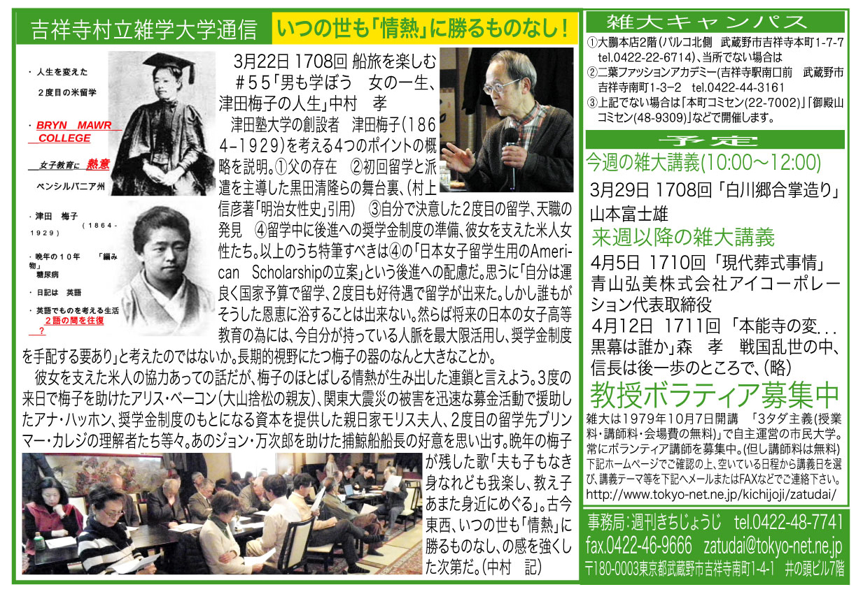 | 3月22日 1708回 | 船旅を楽しむ #55「男も学ぼう 女の一生、津田梅子の人生」中村 孝 | |