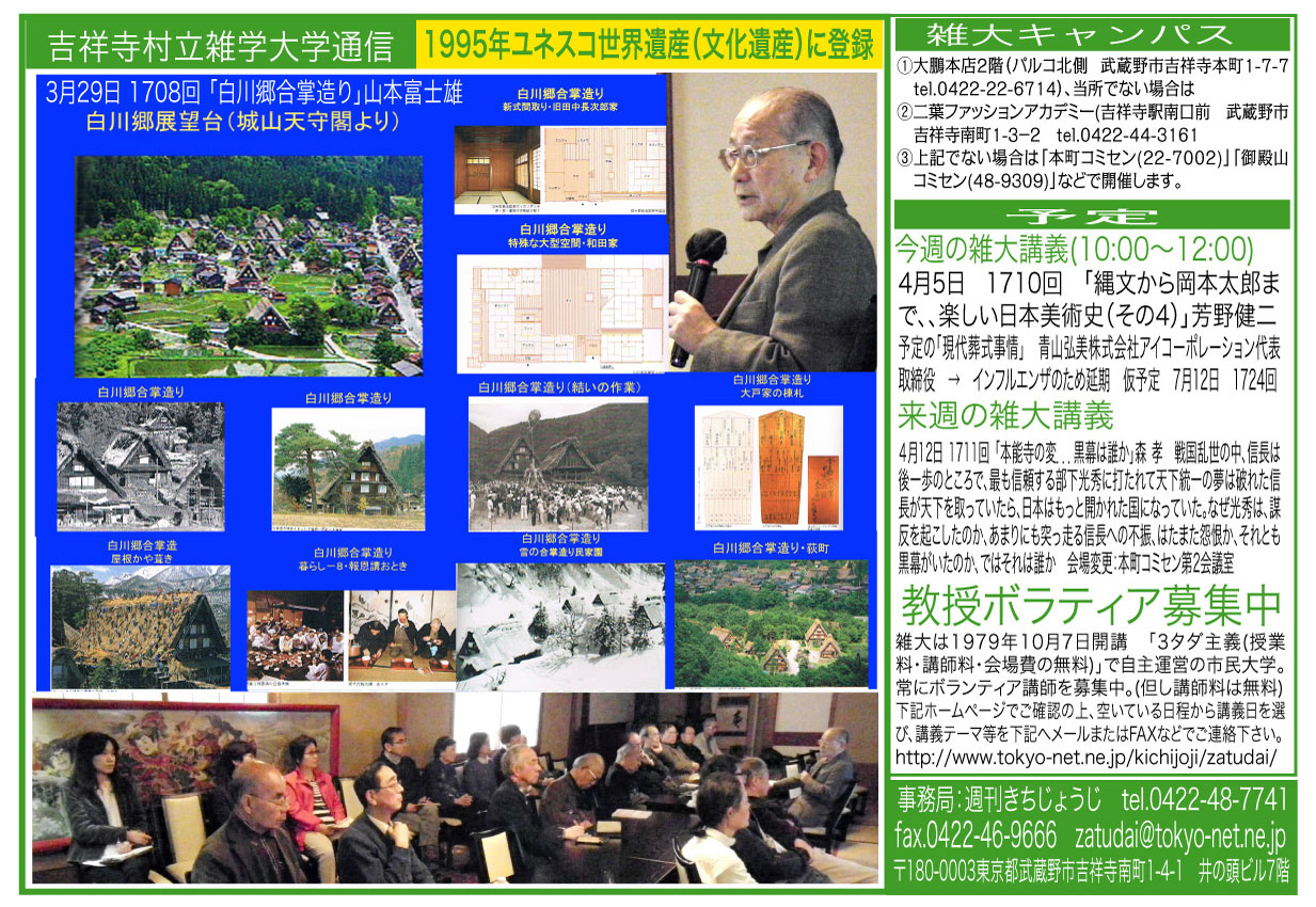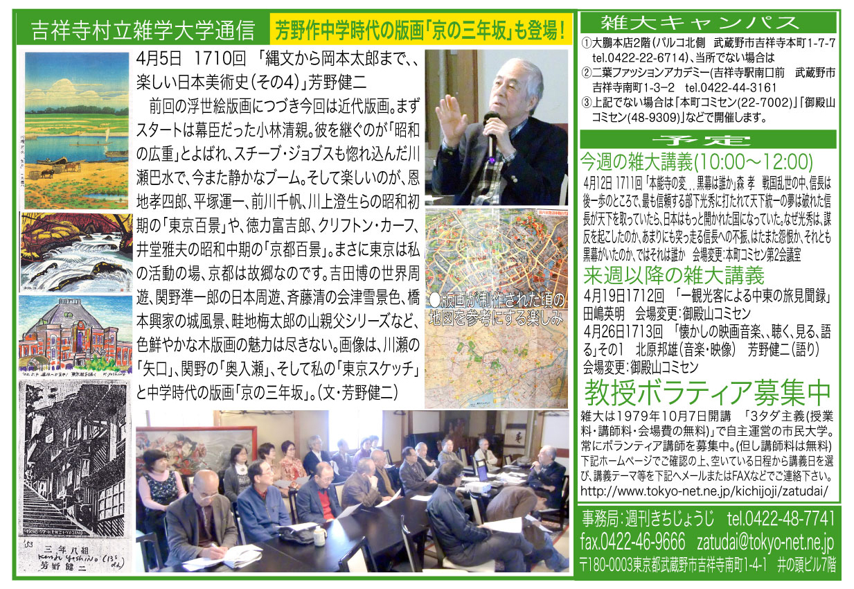 | 4月5日 1710回 | 「縄文から岡本太郎まで、、楽しい日本美術史(その4)」芳野健二 (「現代葬式事情」青山弘美株式会社アイコーポレーション代表取締役はインフルエンザのため講義延期 仮7/12の予定) | |
