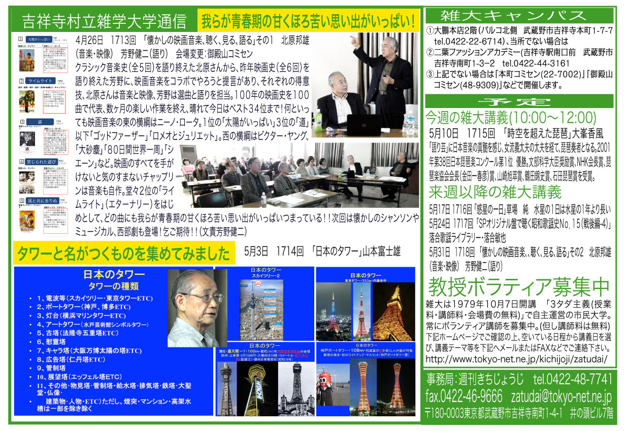 | 5月3日 1714回 | 「日本のタワー」山本富士雄 会場変更:御殿山コミセン | |