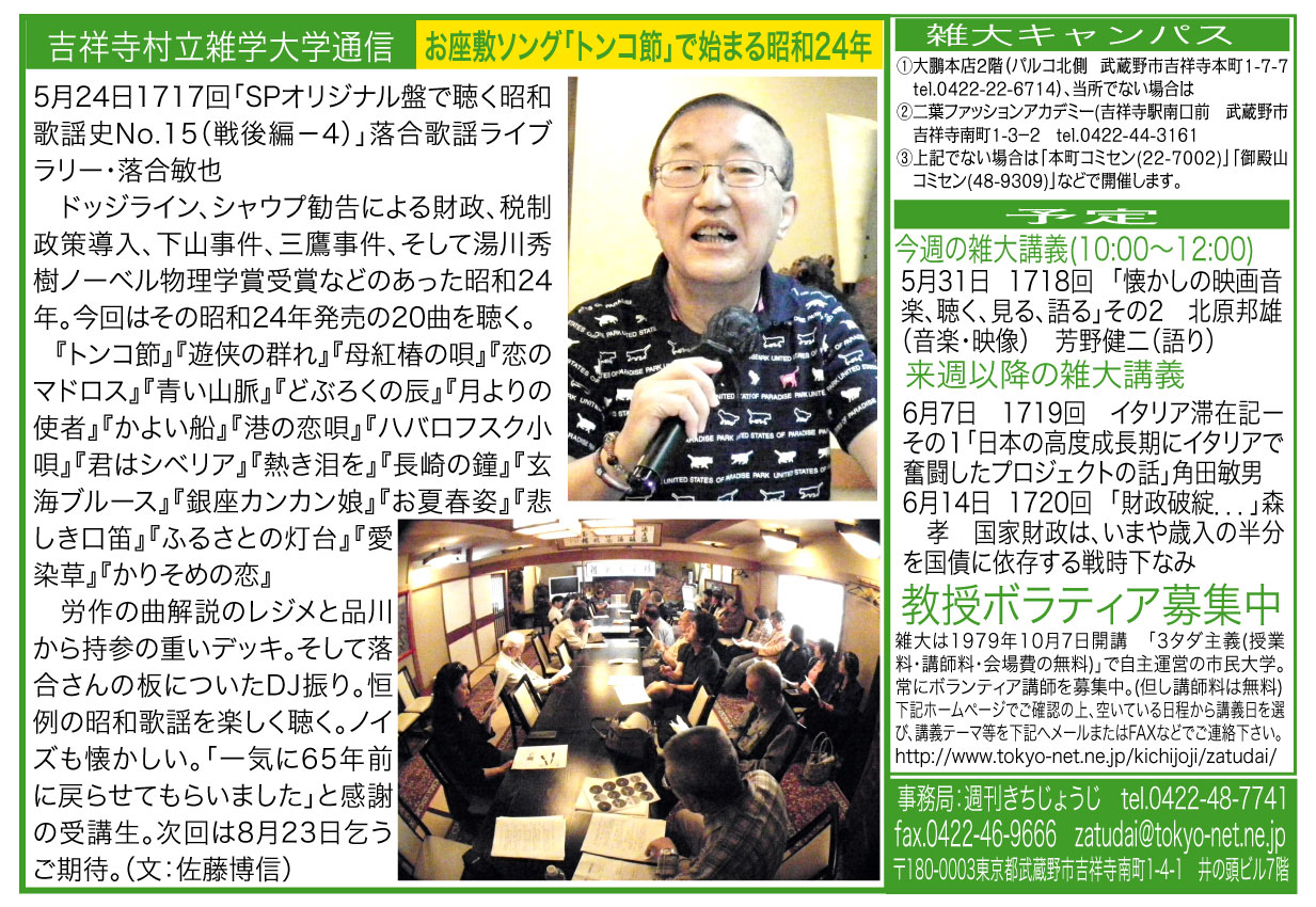 | 5月24日 1717回 | 「SPオリジナル盤で聴く昭和歌謡史No.15(戦後編-4)」落合歌謡ライブラリー・落合敏也 | |