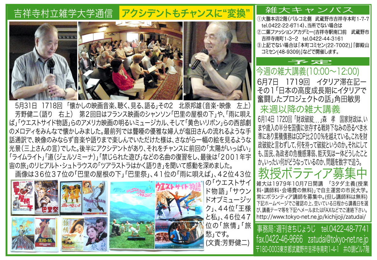 | 6月21日 1721回 | 「懐かしの映画音楽、、聴く、見る、語る」その3 北原邦雄(音楽・映像) 芳野健二(語り) | |