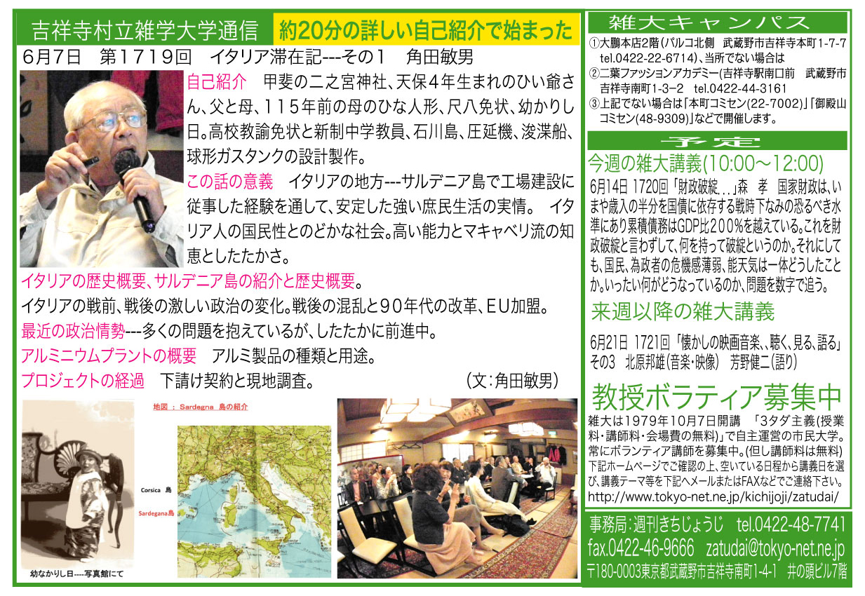 | 6月7日 1719回 | イタリア滞在記ーその1「日本の高度成長期にイタリアで奮闘したプロジェクトの話」角田敏男 | |