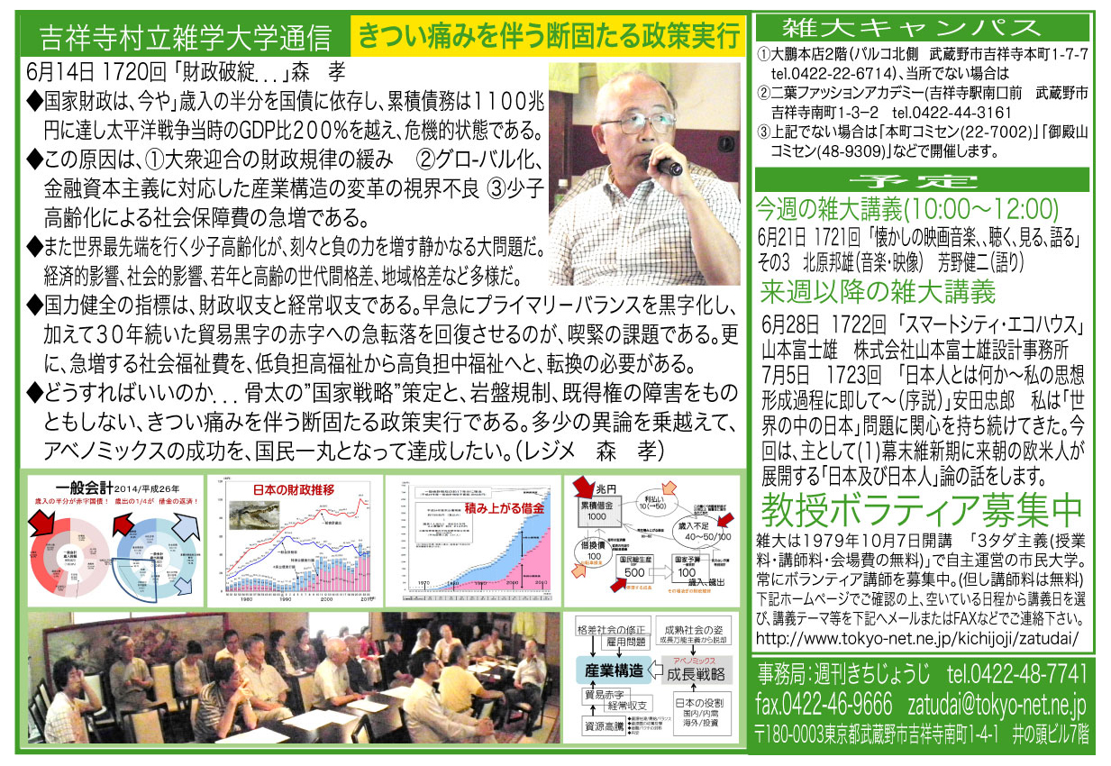 | 6月14日 1720回 | 「財政破綻...」森 孝 国家財政は、いまや歳入の半分を国債に依存する戦時下なみの恐るべき水準にあり累積債務はGDP比200%を越えている。これを財政破綻と言わずして、何を持って破綻というのか。それにしても、国民、為政者の危機感薄弱、能天気は一体どうしたことか。いったい何がどうなっているのか、問題を数字で追う。 | |