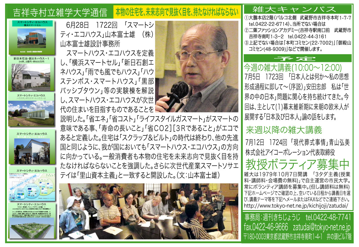 | 6月28日 1722回 | 「スマートシティ・エコハウス」山本富士雄 株式会社山本富士雄設計事務所 |