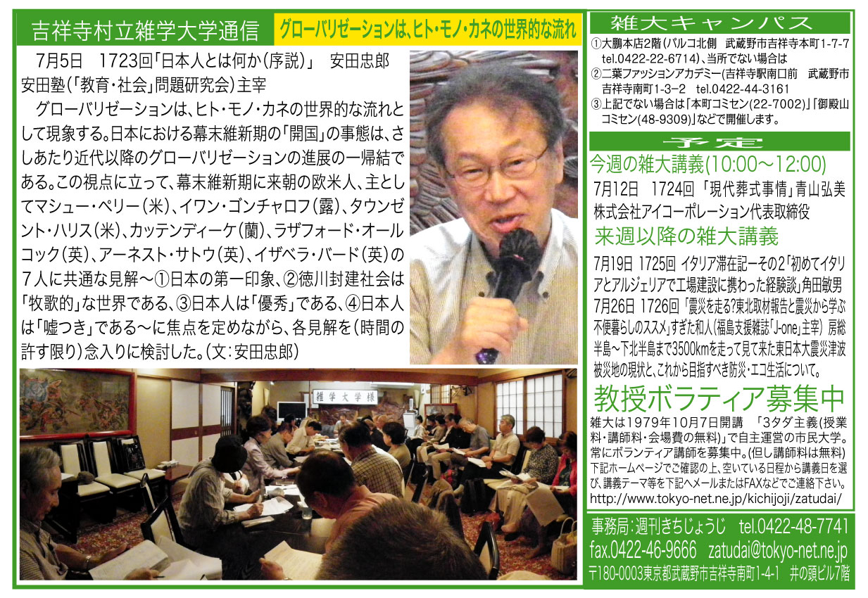 | 7月5日 1723回 | 「日本人とは何か〜私の思想形成過程に即して〜(序説)」安田忠郎 私は「世界の中の日本」問題に関心を持ち続けてきた。今回は、主として(1)幕末維新期に来朝の欧米人が展開する「日本及び日本人」論の話をします。 | |