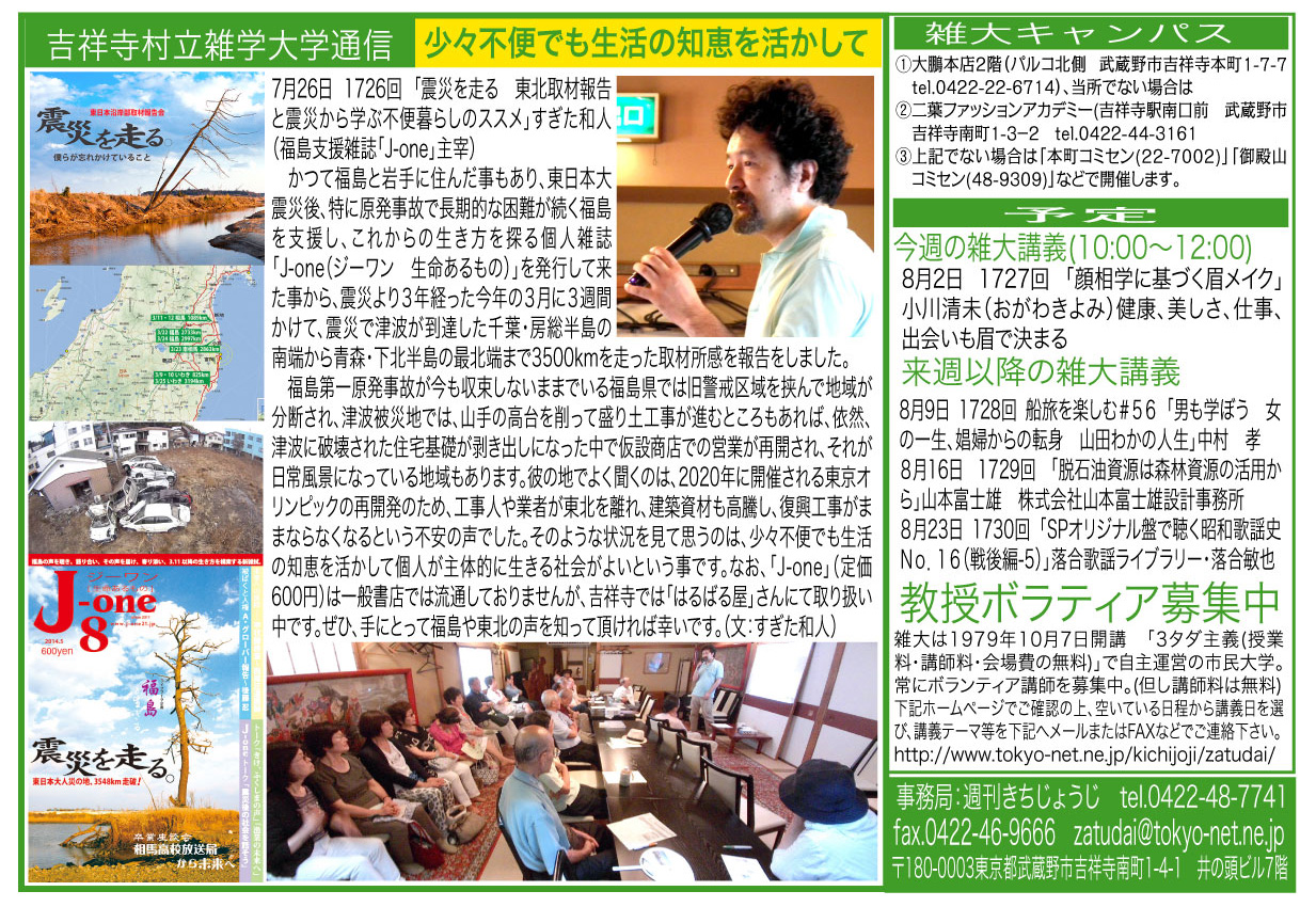 | 7月26日 1726回 | 「震災を走る〜東北取材報告と震災から学ぶ不便暮らしのススメ」 すぎた和人(福島支援雑誌「J-one」主宰) 房総半島〜下北半島まで3500kmを走って見て来た東日本大震災津波被災地の現状と、これから目指すべき防災・エコ生活について。 |