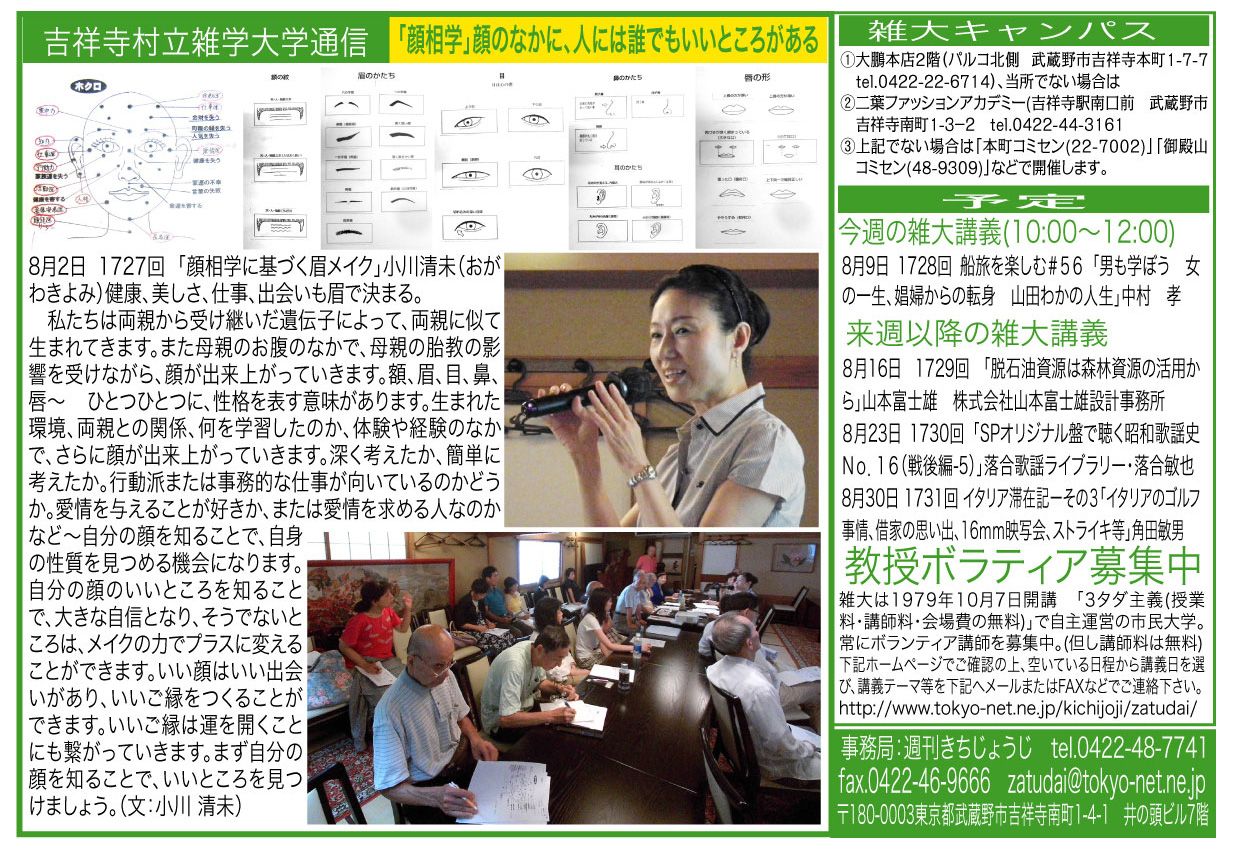 | 8月2日 1727回 | 「顔相学に基づく眉メイク」小川 清未(おがわきよみ) 健康、美しさ、仕事、出会いも眉で決まる | |