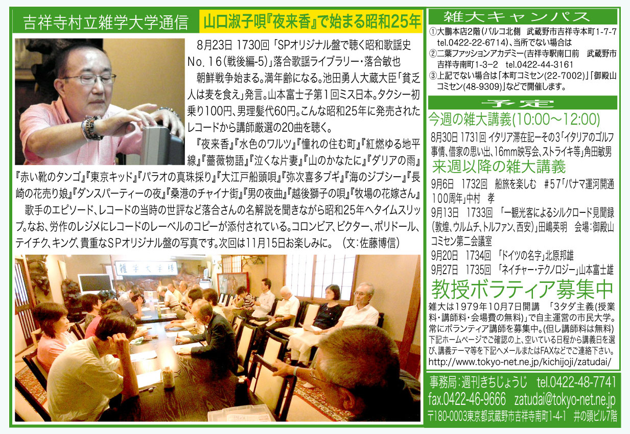 | 8月23日 1730回 | 「SPオリジナル盤で聴く昭和歌謡史No.16(戦後編-5)」落合歌謡ライブラリー・落合敏也 | |