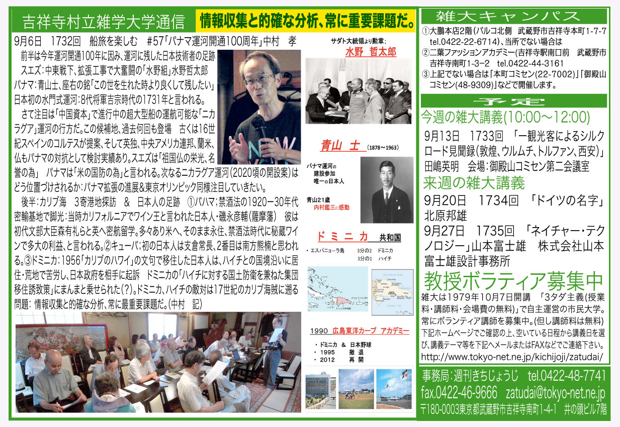 | 9月6日 1732回 | 船旅を楽しむ #57「パナマ運河開通100周年」中村 孝 | |