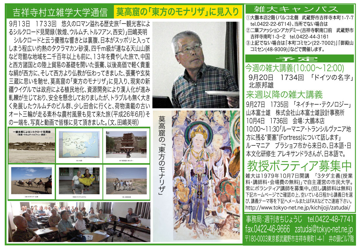 | 9月13日 1733回 | 「一観光客によるシルクロード見聞録(敦煌、ウルムチ、トルファン、西安)」田嶋英明 会場:御殿山コミセン第二会議室 |