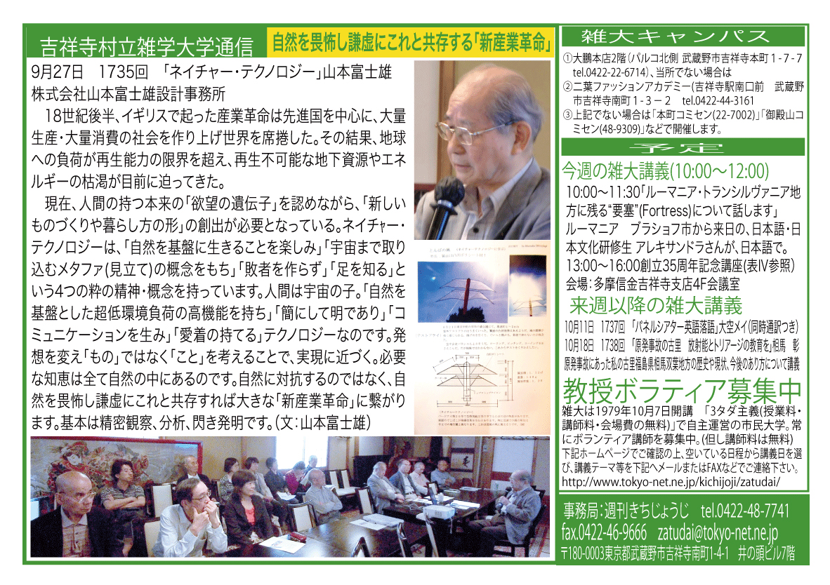 | 9月27日 1735回 | 「ネイチャー・テクノロジー」山本富士雄 株式会社山本富士雄設計事務所 |