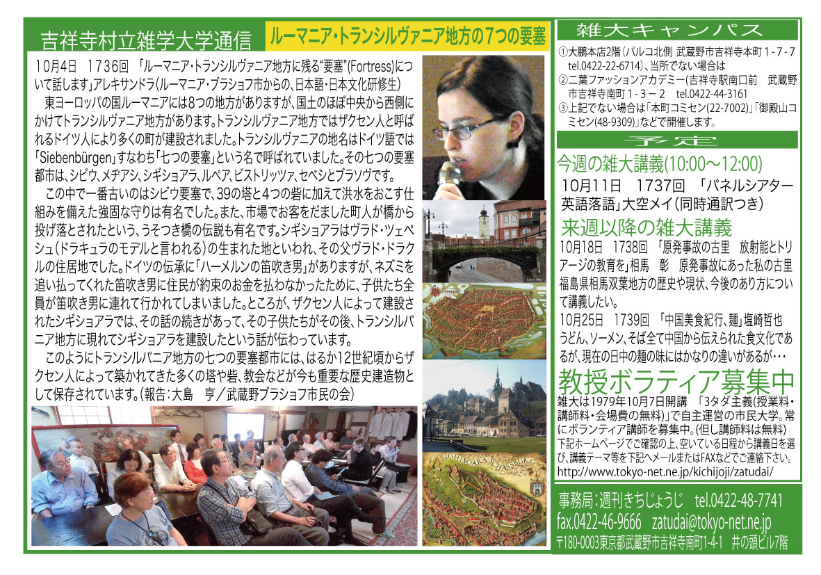 雑学大学通常講義 1736回 会場:大鵬本店 10:00〜11:30「ルーマニア トランシルヴァニア地方に残る“要塞”(fortress)について話します」アレキサドラ研修生(ルーマニアから日本語・日本文化研修生) 11:30〜12:30 大鵬本店にて有志による昼食 会場を多摩信用金庫吉祥寺支店4F会議室に移動して 雑学大学創立35周年記念講座 会場:多摩信金吉祥寺支店4F会議室 12:45 受付開始 13:00〜16:00「雑大創立35周年記念講座」 挨拶 邑上守正武蔵野市長(雑学大学教授) 1、「落語『死に神』考 洋の東西・我が国での働き・死神萬歳!!」西本晃二学長 ここで記念撮影しました 2、座談会「今、雑学大学が面白い」 司会:草場純 雑学大学講師 三上卓治 芳野健二 中村孝 閉会挨拶 大竹桂子副学長 16:00 会場退出完了 |