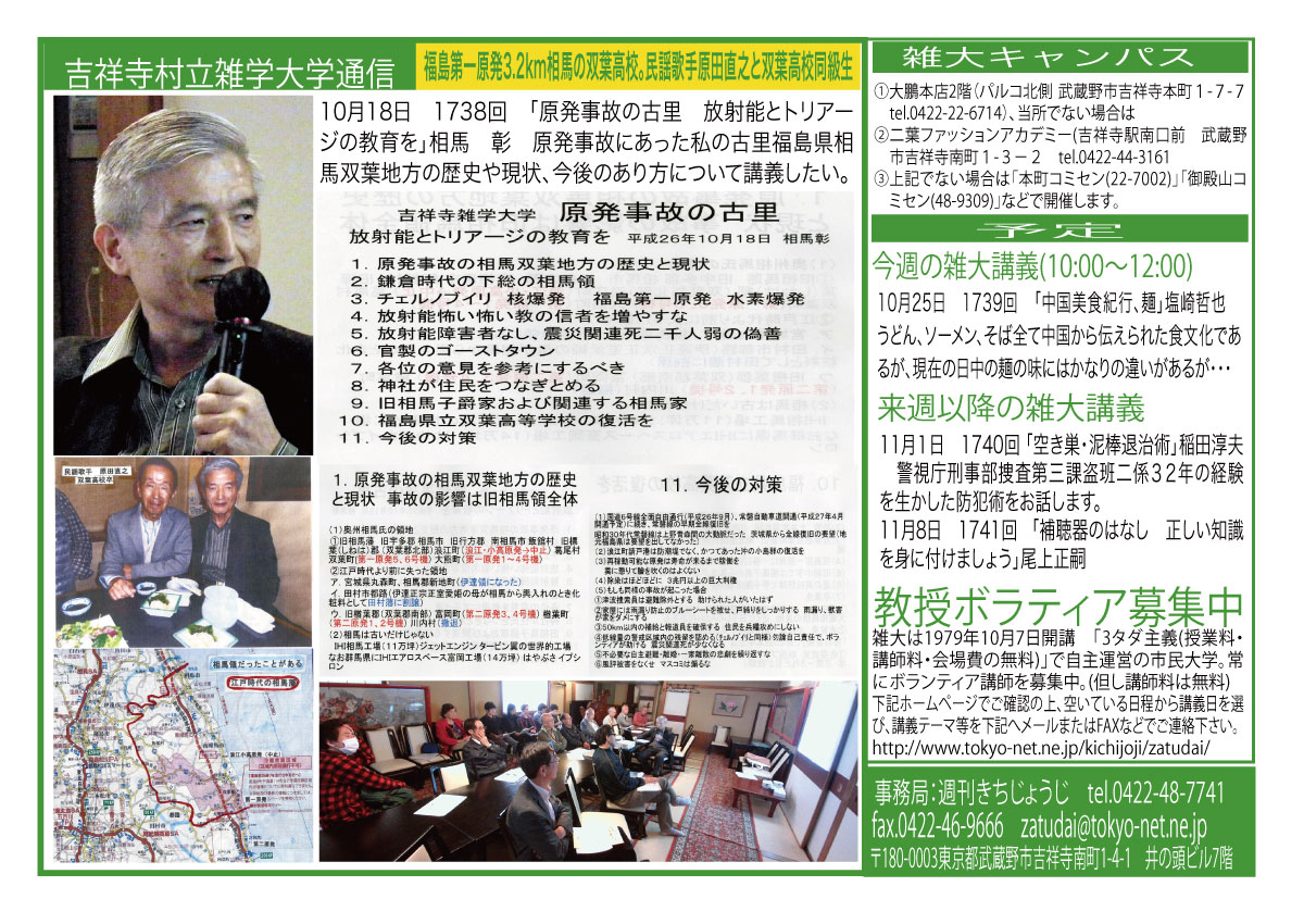 | 10月18日 1738回 | 「原発事故の古里 放射能とトリアージの教育を」相馬 彰 原発事故にあった私の古里福島県相馬双葉地方の歴史や現状、今後のあり方について講義したい。 | |