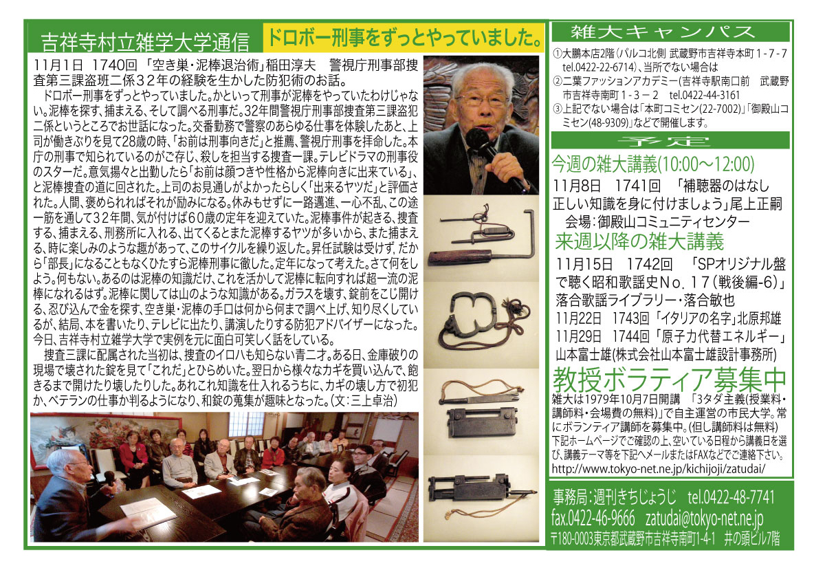 | 11月1日 1740回 | 「空き巣・泥棒退治術」稲田淳夫 警視庁刑事部捜査第三課盗班二係32年の経験を生かした防犯術をお話します。 | |