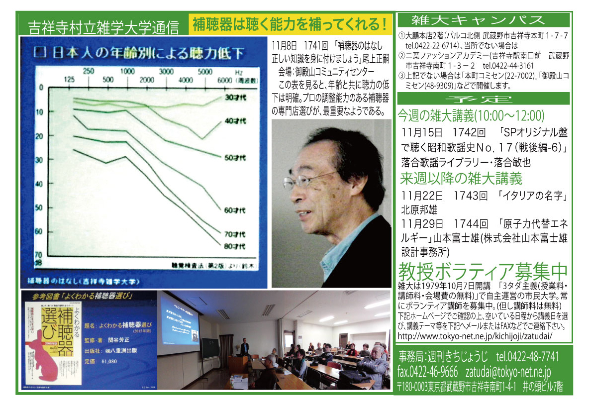 | 11月8日 1741回 | 「補聴器のはなし 正しい知識を身に付けましょう」尾上正嗣 会場:御殿山コミセン | |