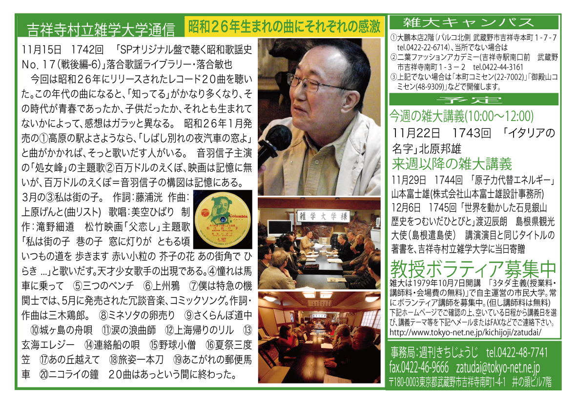 | 11月15日 1742回 | 「SPオリジナル盤で聴く昭和歌謡史No.17(戦後編-6)」落合歌謡ライブラリー・落合敏也 | |