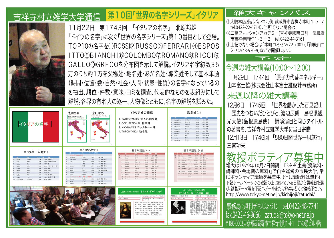 | 11月22日 1743回 | 「イタリアの名字」北原邦雄 | |
