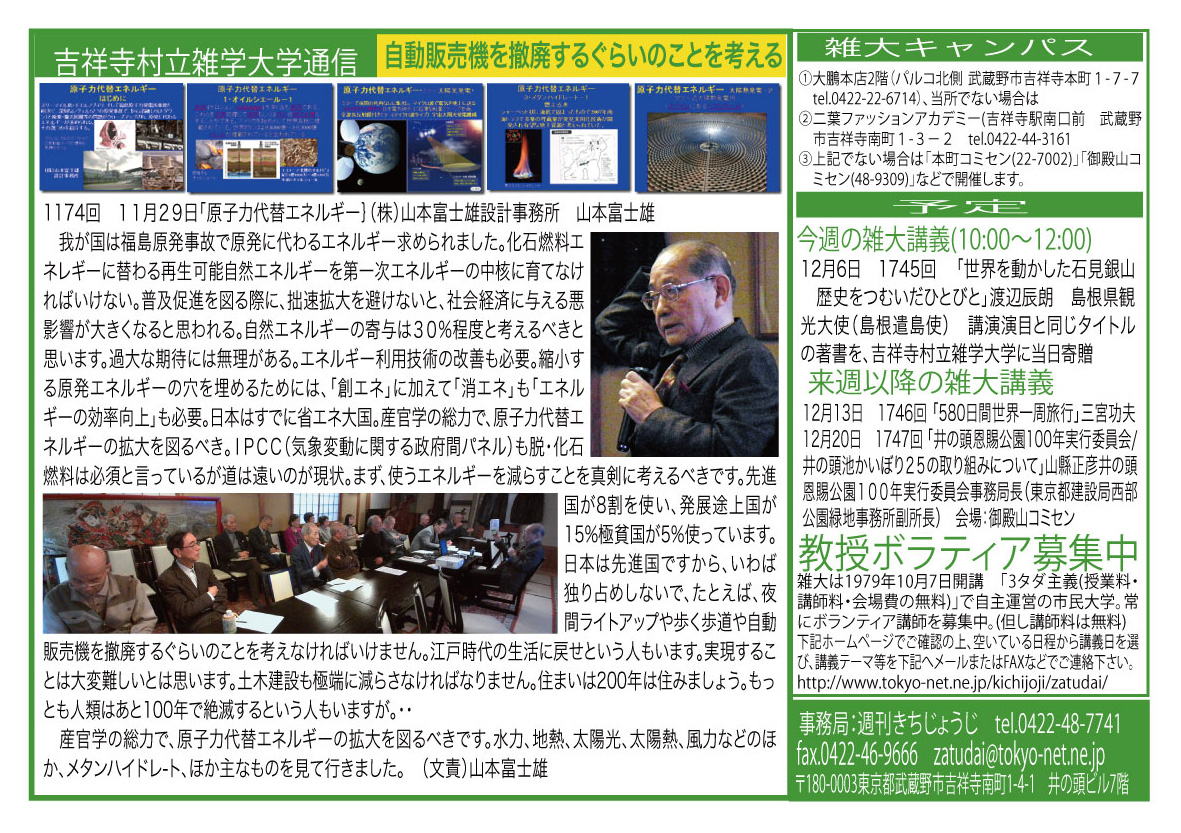 | 11月29日 1744回 | 「原子力代替エネルギー」山本富士雄(株式会社山本富士雄設計事務所) |