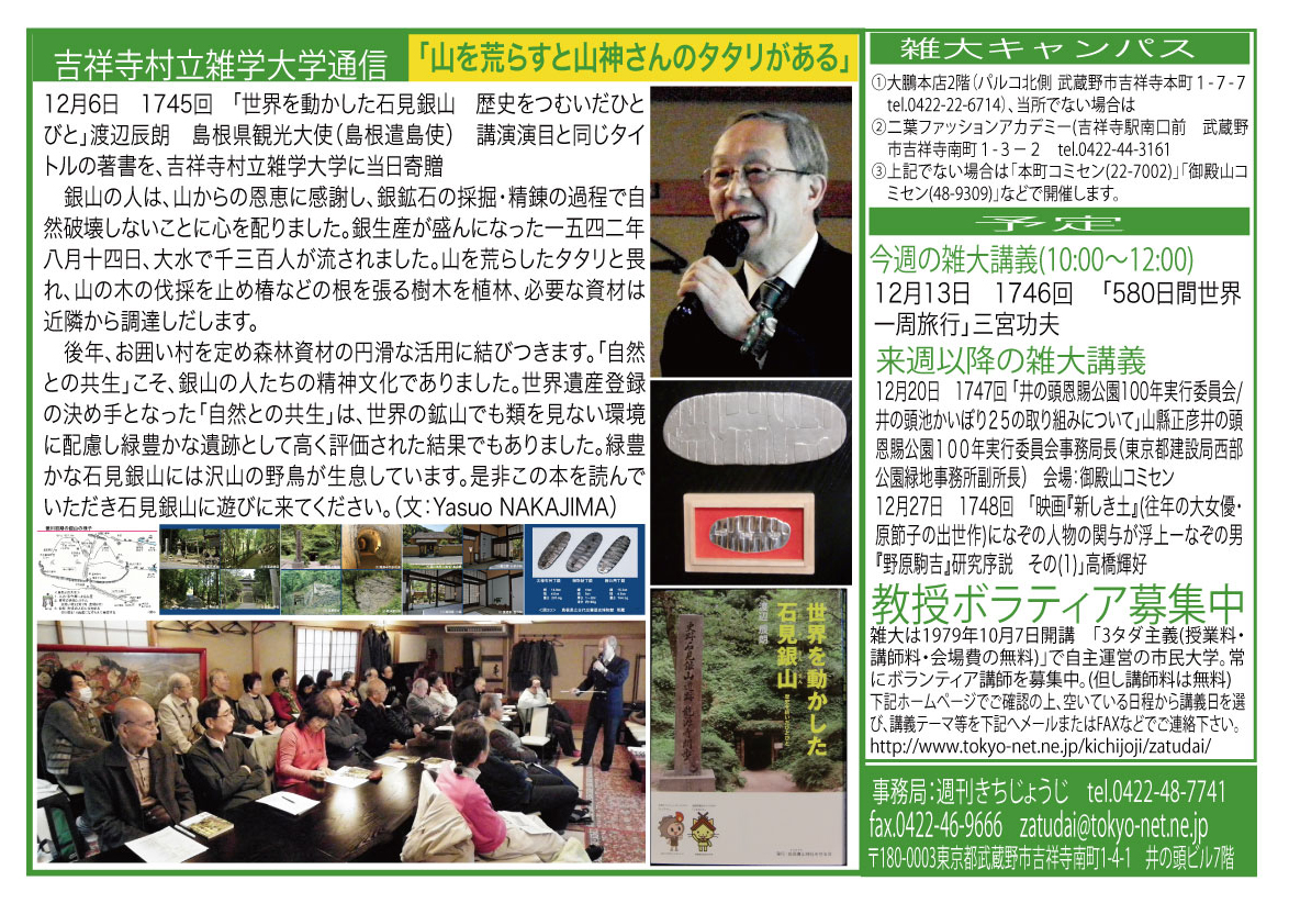 | 12月6日 1745回 | 「世界を動かした石見銀山 歴史をつむいだひとびと」渡辺辰朗 島根県観光大使(島根遣島使) 講演演目と同じタイトルの著書を、吉祥寺村立雑学大学に当日寄贈 | |