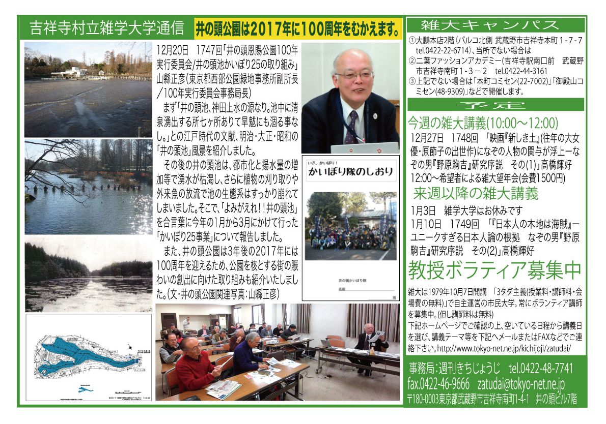 | 12月20日 1747回 | 「井の頭恩賜公園100年実行委員会/井の頭池かいぼり25の取り組みについて」山縣正彦井の頭恩賜公園100年実行委員会事務局長(東京都建設局 西部公園緑地事務所副所長) 会場:御殿山コミセン | |
