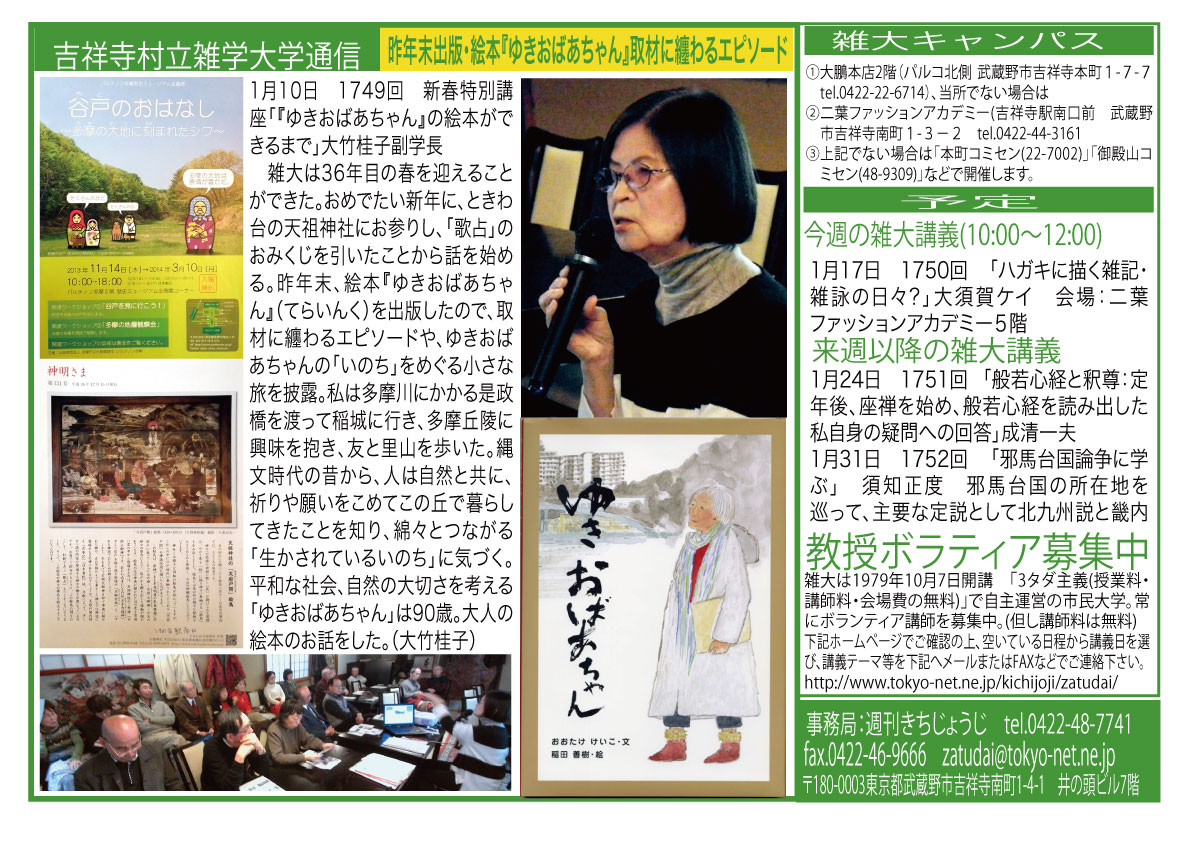 | 1月10日 1749回 | 新春特別講座 (講座変更しました) 「『ゆきおばあちゃん』の絵本ができるまで」大竹 桂子 他 |