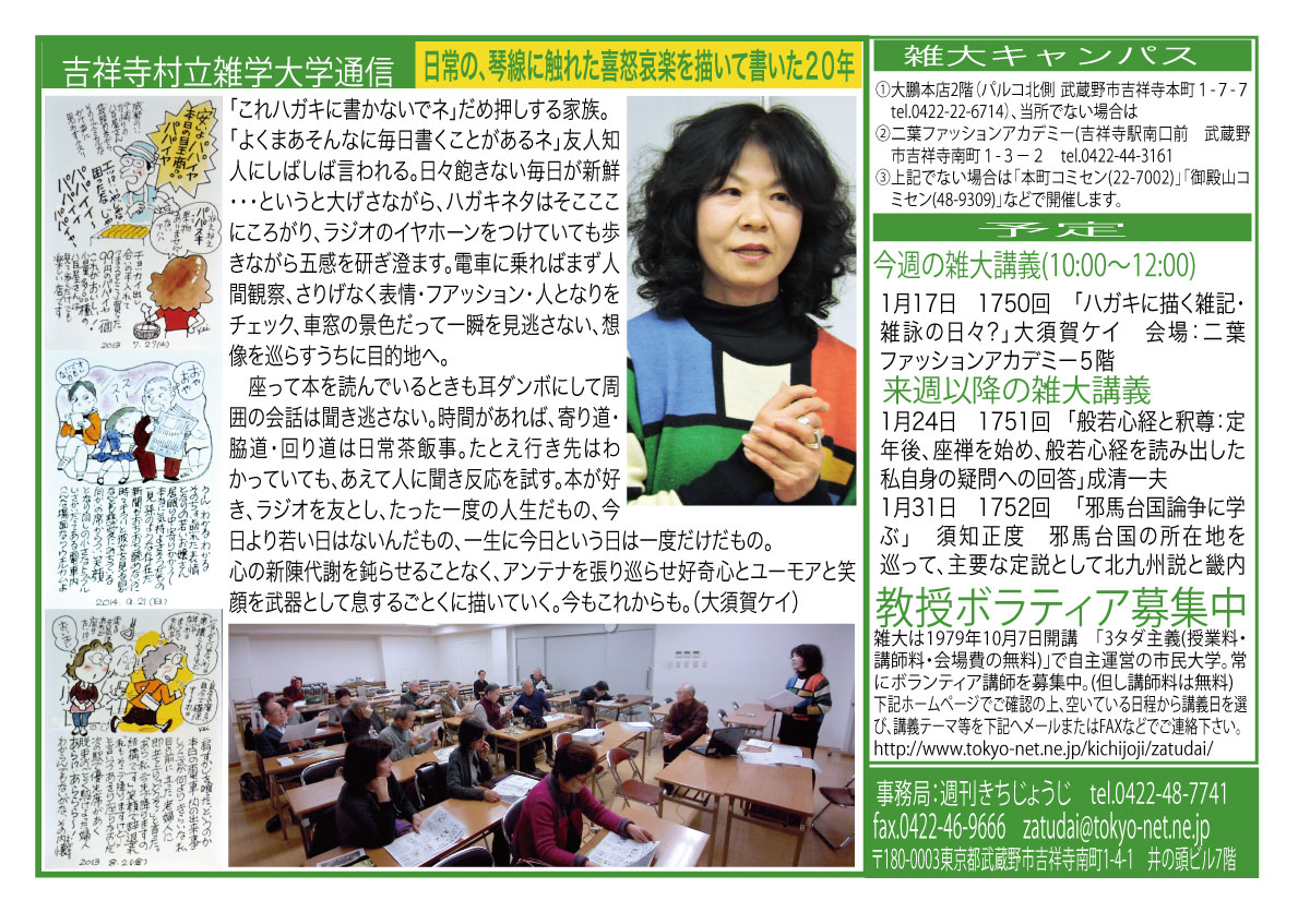 | 1月17日 1750回 | 「ハガキに描く雑記・雑詠の日々?」大須賀ケイ 会場:二葉ファッションアカデミー5階 |