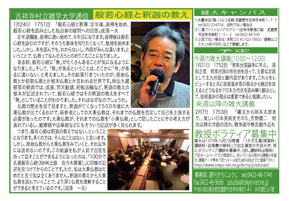 | 1月24日 1751回 | 1月24日「般若心経と釈尊:定年後、座禅を始め、般若心経を読み出した私自身の疑問への回答」成清一夫 | |
