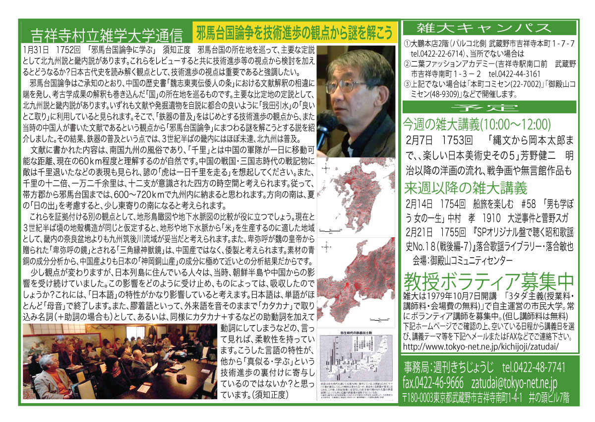 | 1月31日 1752回 | 「邪馬台国論争に学ぶ」須知正度 邪馬台国の所在地を巡って、主要な定説として北九州説と畿内説があります。これらをレビューすると共に技術進歩等の視点から検討を加えるとどうなるか?日本古代史を読み解く観点として、技術進歩の視点は重要であると強調したい。 |