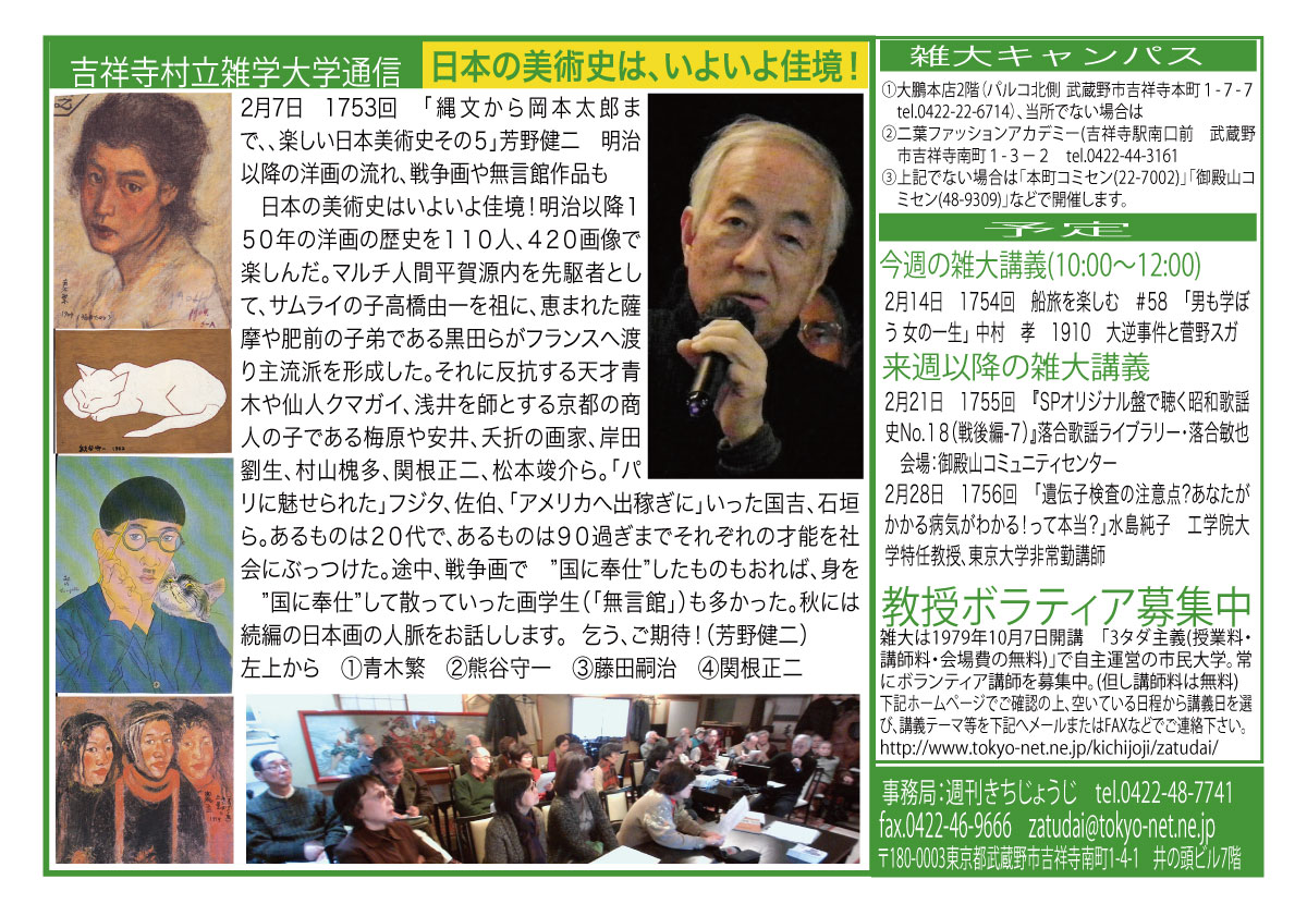 | 2月7日 1753回 | 2月7日(土)「縄文から岡本太郎まで、、楽しい日本美術史その5」芳野健二 明治以降の洋画の流れ、戦争画や無言館作品も |