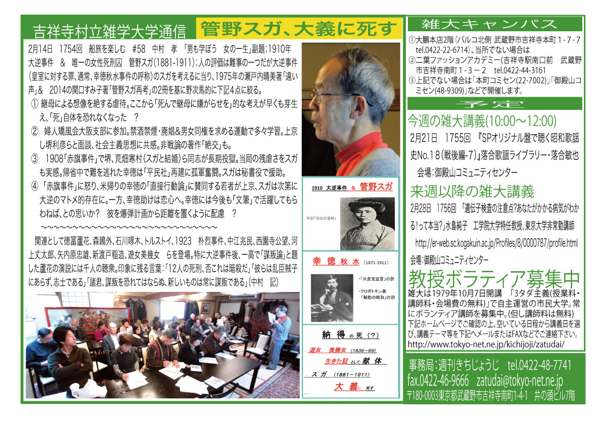 | 2月14日 1754回 | 2015 FEB 14 船旅を楽しむ #58 「男も学ぼう 女の一生」 中村 孝 1910 大逆事件と菅野スガ | |