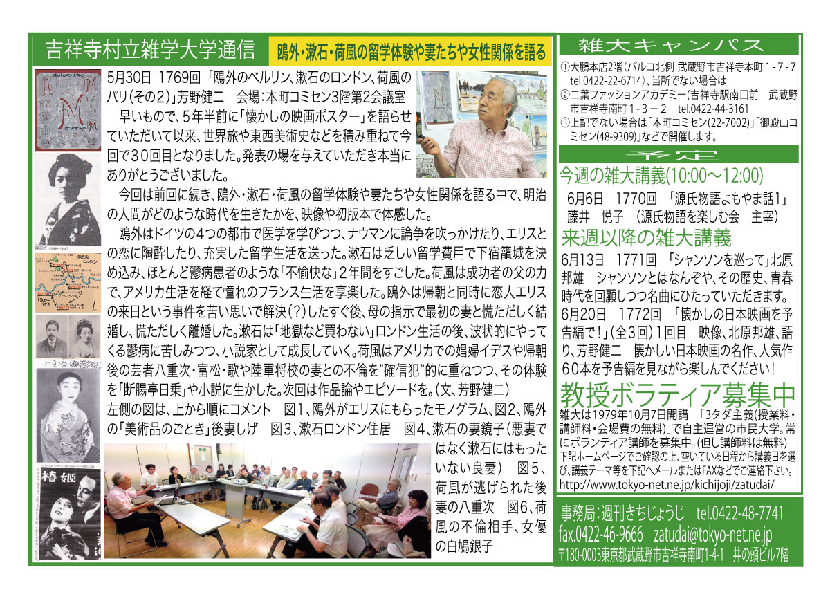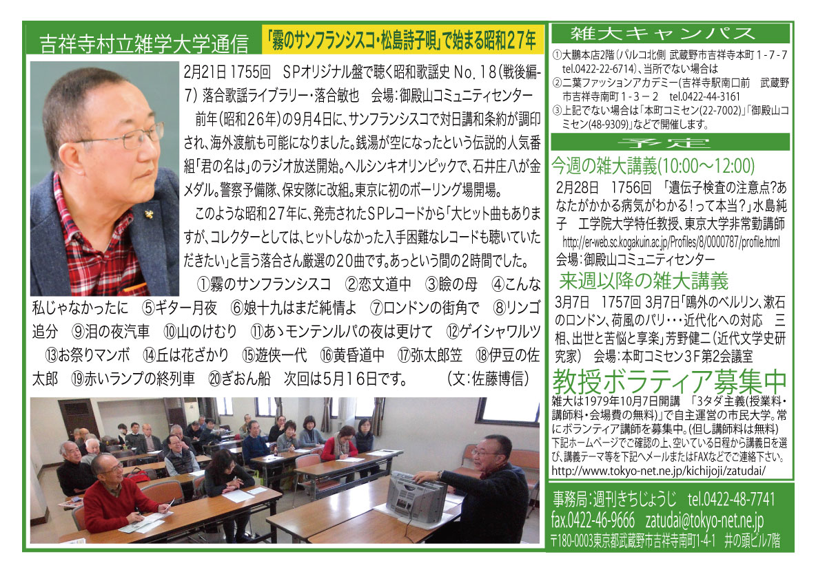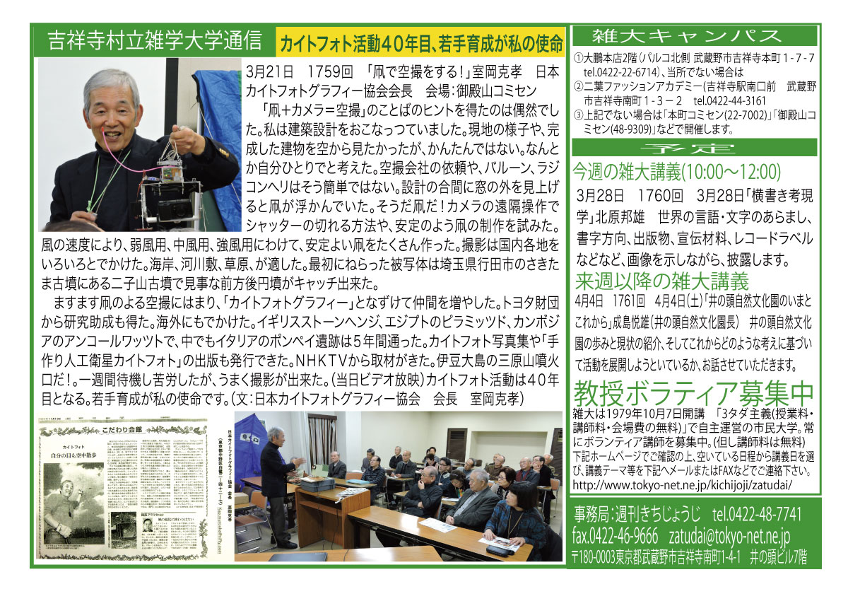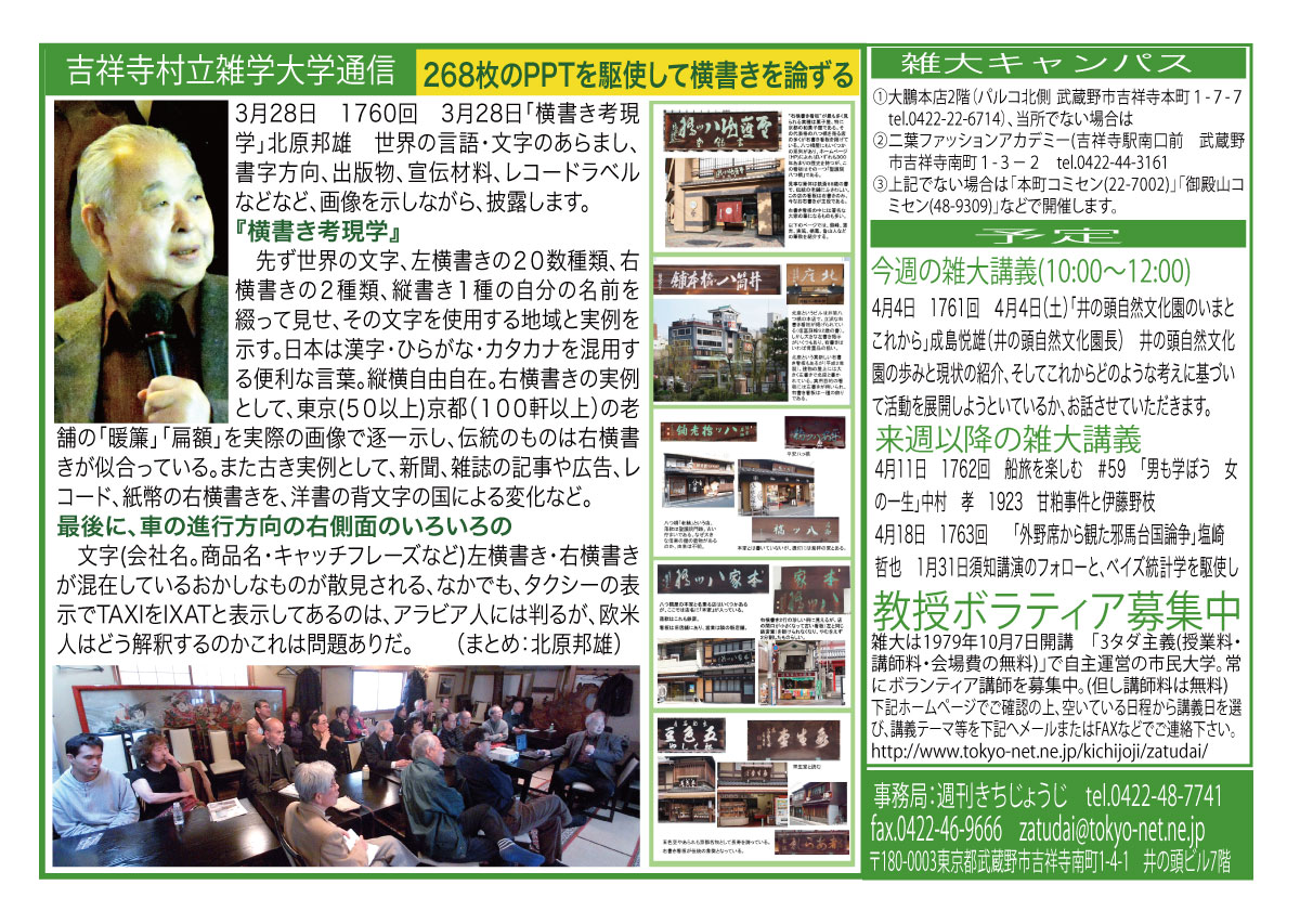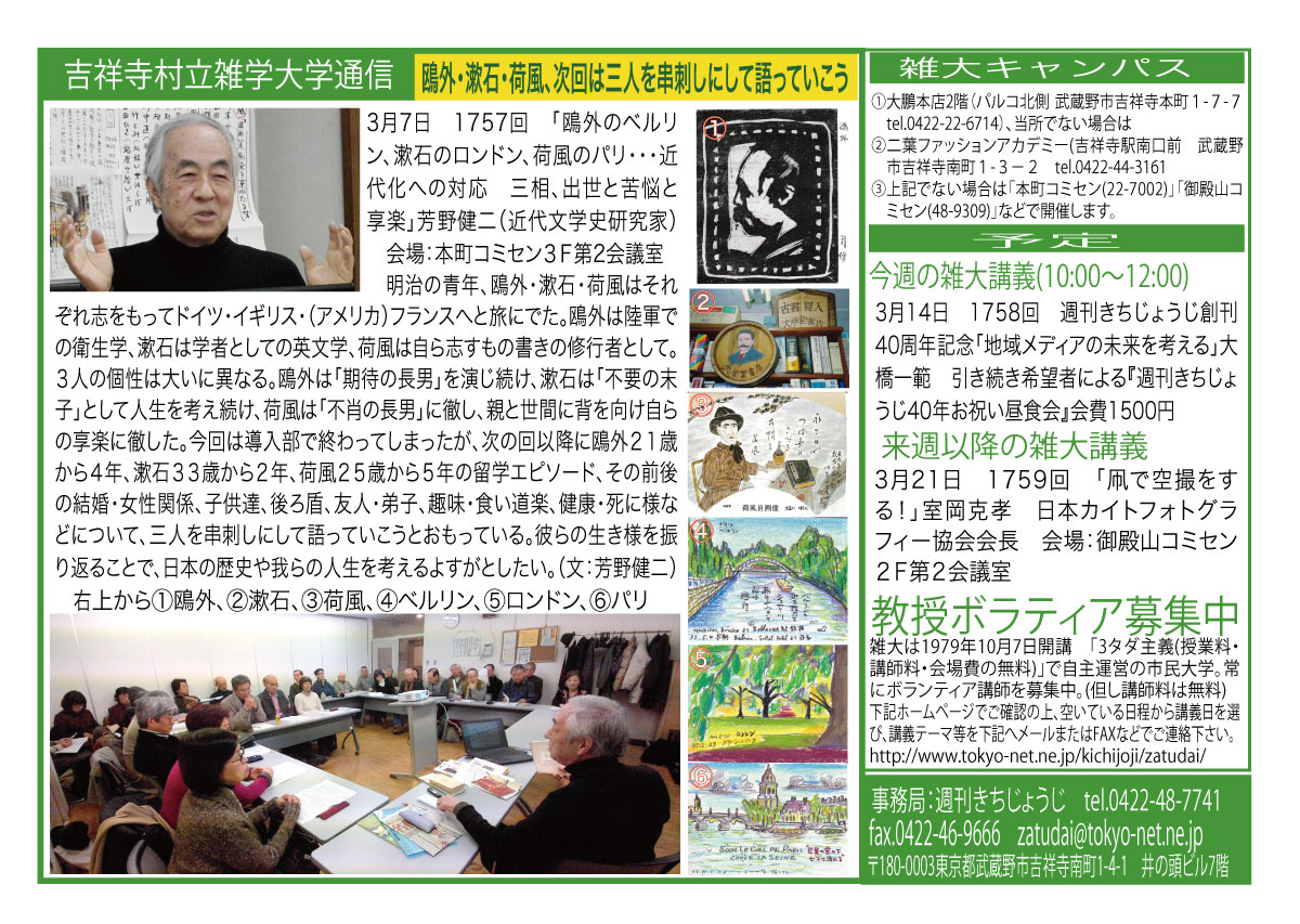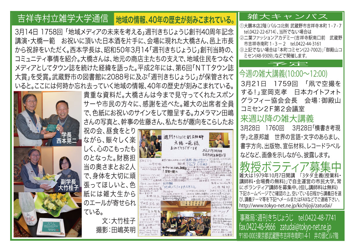 | 3月14日 1758回 | 3月14日 週刊きちじょうじ創刊40周年記念「地域メディアの未来を考える」大橋一範 引き続き希望者による『週刊きちじょうじ40年お祝い昼食会』会費1500円 |