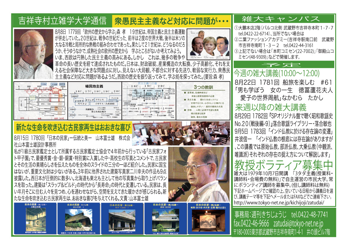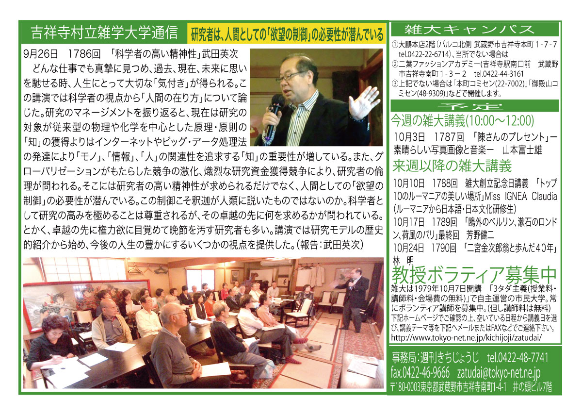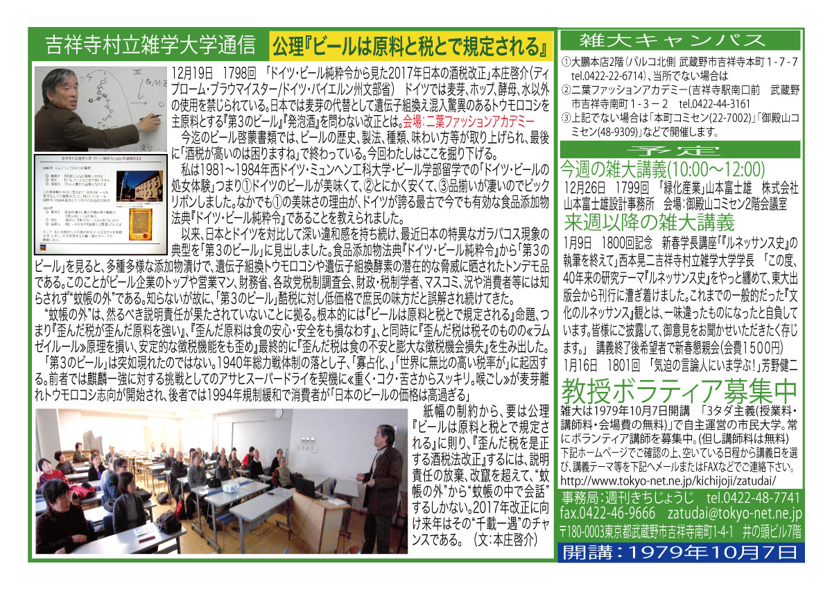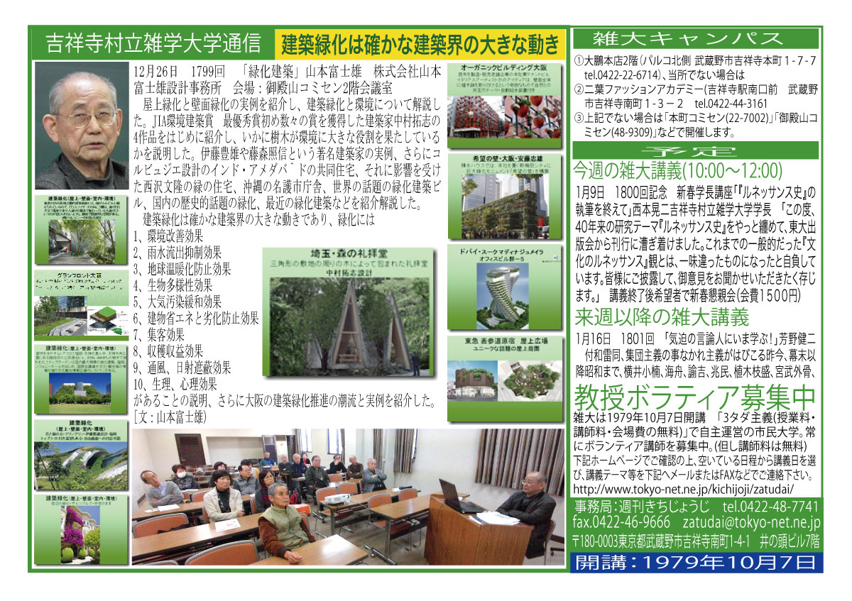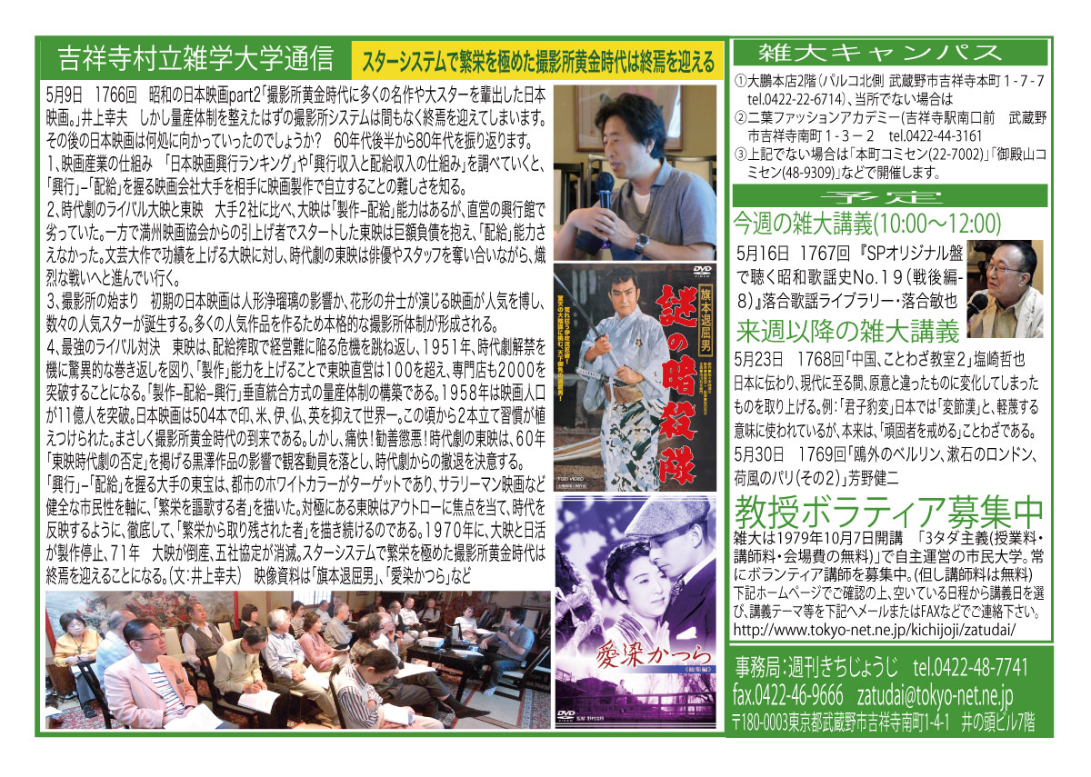 | 3月14日 1758回 | 3月14日 週刊きちじょうじ創刊40周年記念「地域メディアの未来を考える」大橋一範 引き続き希望者による『週刊きちじょうじ40年お祝い昼食会』会費1500円 |
