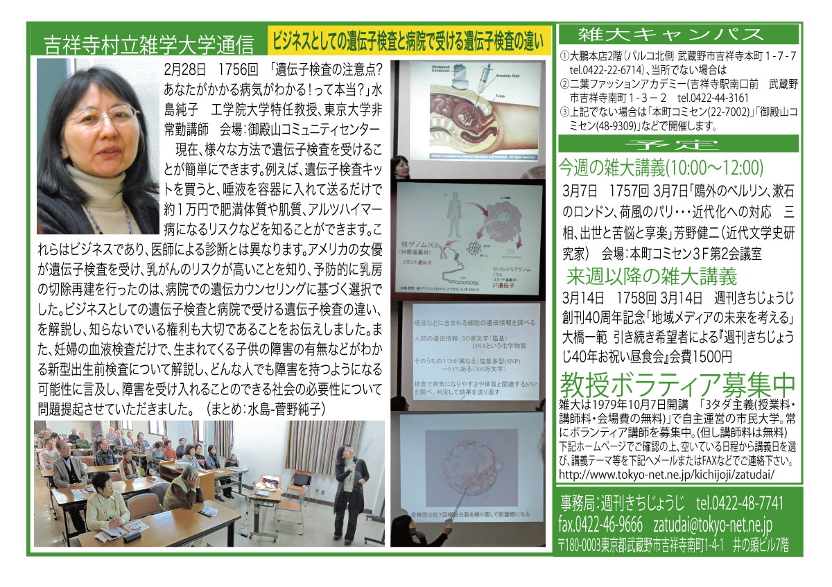 | 2月28日 1756回 | 2月28日(土)「遺伝子検査の注意点?あなたがかかる病気がわかる!って本当?」水島純子 工学院大学特任教授、東京大学非常勤講師 http://er-web.sc.kogakuin.ac.jp/Profiles/8/0000787/profile.html 会場:御殿山コミュニティセンター2階会議室 |