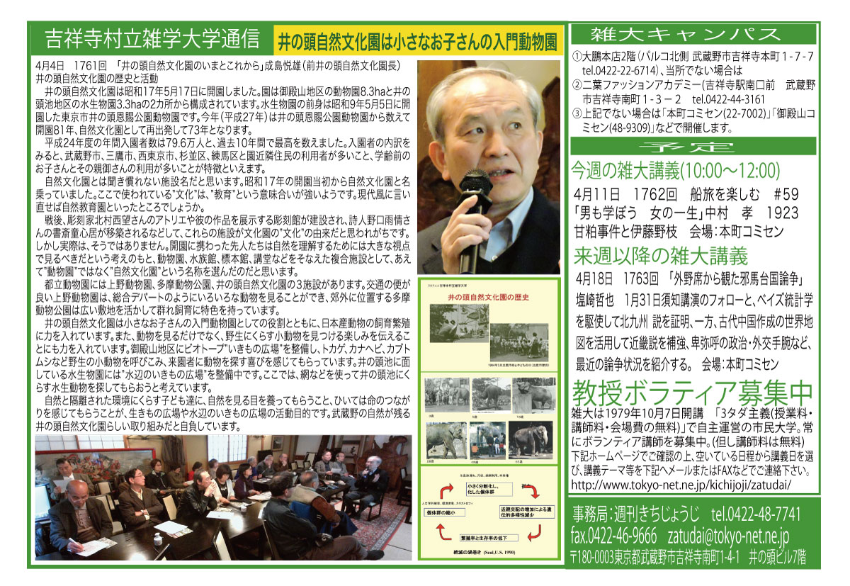 | 4月4日 1761回 | 4月4日(土)「井の頭自然文化園のいまとこれから」成島悦雄(井の頭自然文化園長) 井の頭自然文化園の歩みと現状の紹介、そしてこれからどのような考えに基づいて活動を展開しようといているか、お話させていただきます。 |