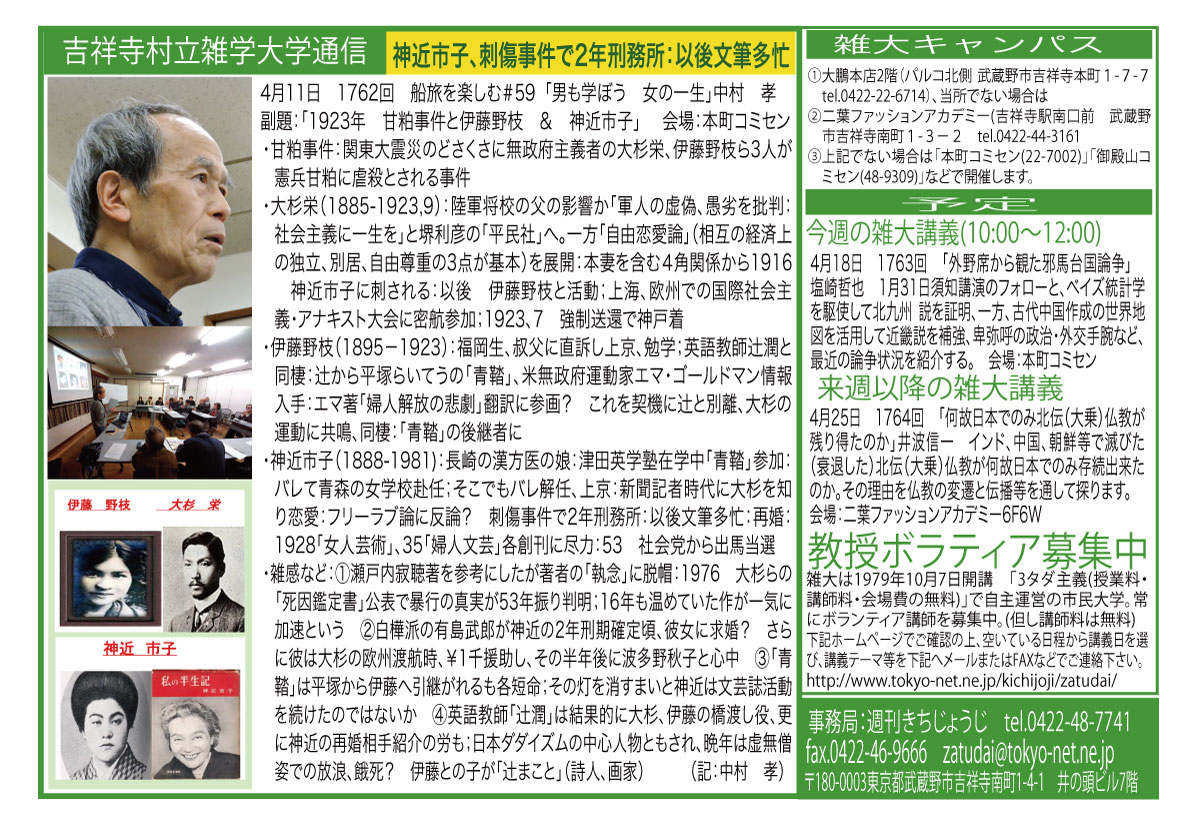 | 4月11日 1762回 | 2015 APR 11 船旅を楽しむ #59 「男も学ぼう 女の一生」中村 孝 1923 甘粕事件と伊藤野枝 会場:本町コミセン |