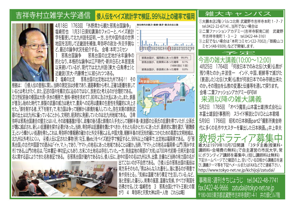 | 4月18日 1763回 | 4月18日(土) 「外野席から観た邪馬台国論争」塩崎 哲也 1月31日須知講演のフォローと、ベイズ統計学を駆使して北九州 説を証明、一方、古代中国作成の世界地図を活用して近畿説を補強、卑弥呼の政治・外交手腕など、最近の論争状況を紹介する。 会場:本町コミセン | |