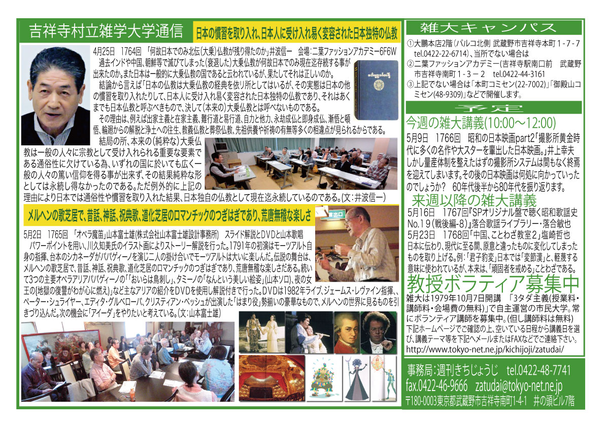 | 5月2日 1765回 | 5月2日「オペラ魔笛」山本富士雄(株式会社山本富士雄設計事務所) スライド解説とDVDと山本歌唱 | |