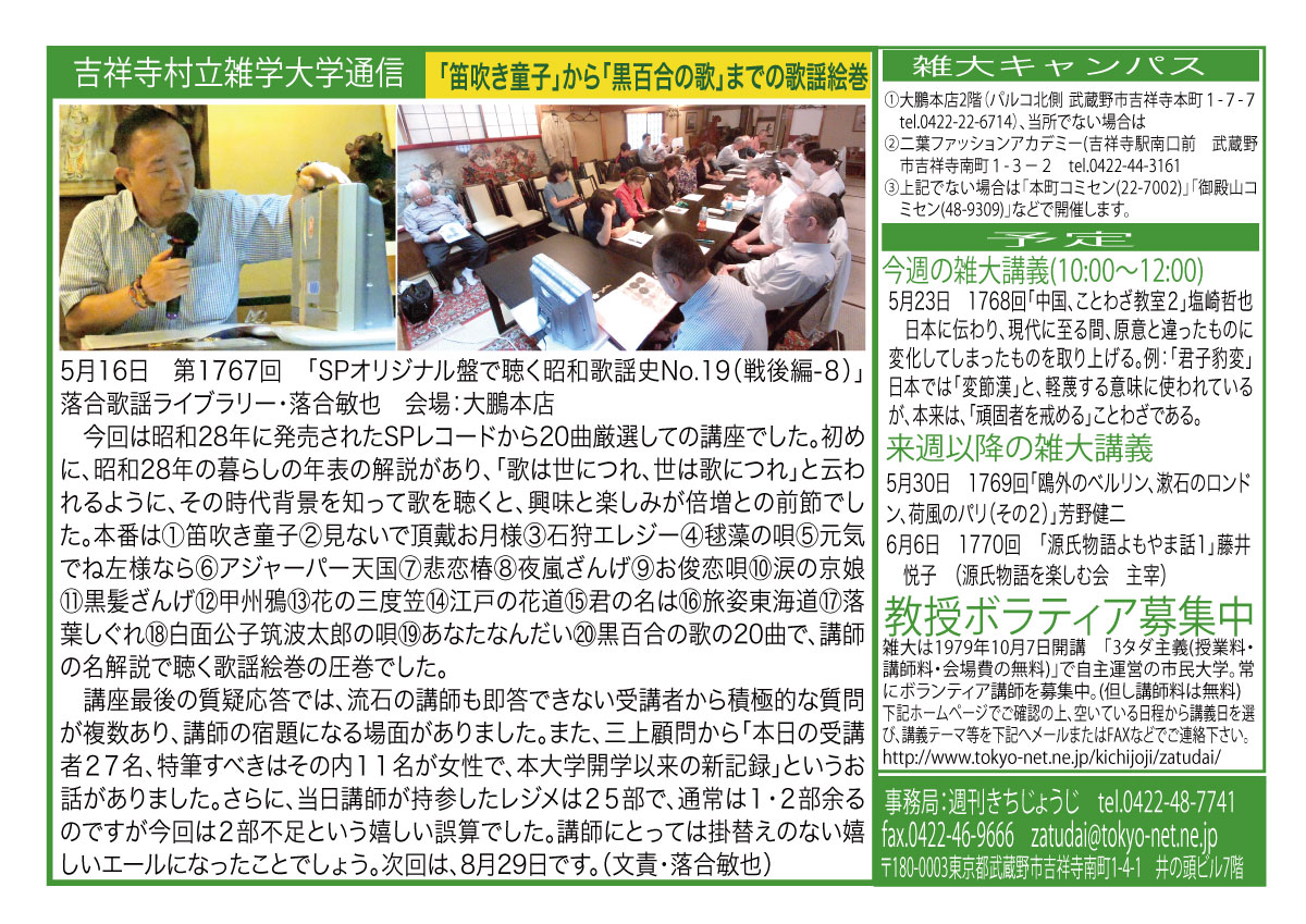 | 5月16日 1767回 | 5月16日(土)『SPオリジナル盤で聴く昭和歌謡史No.19(戦後編-8)』落合歌謡ライブラリー・落合敏也 |