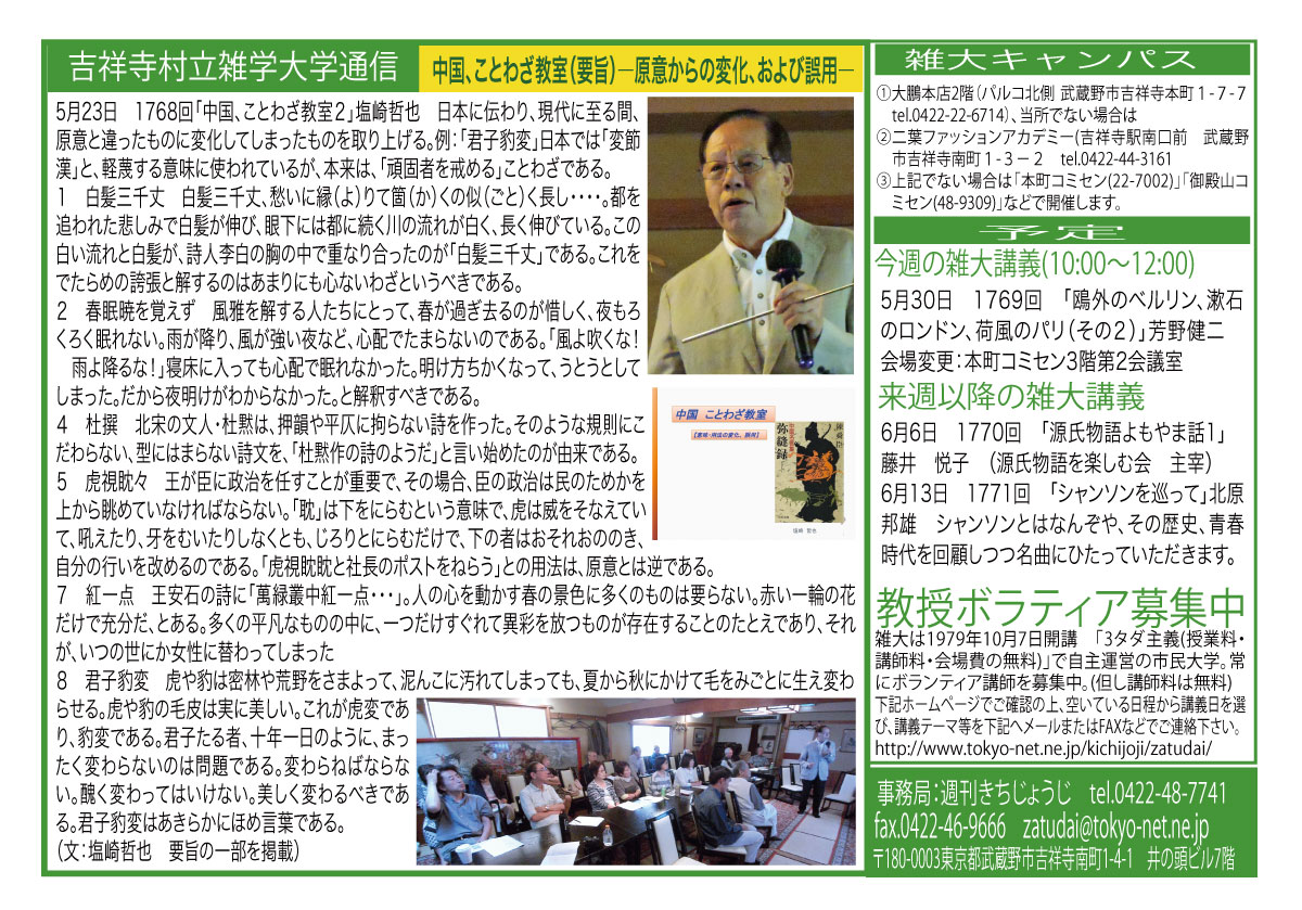 | 5月23日 1768回 | 5月23日「中国、ことわざ教室2」塩崎哲也 日本に伝わり、現代に至る間、原意と違ったものに変化してしまったものを取り上げる。例:「君子豹変」日本では「変節漢」と、軽蔑する意味に使われているが、本来は、「頑固者を戒める」ことわざである。 |