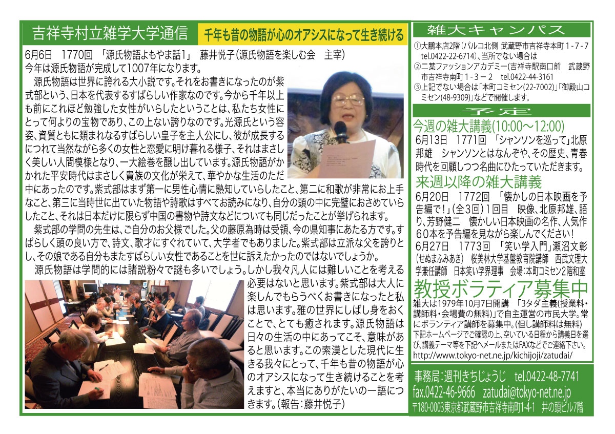| 6月6日 1770回 | 6月6日(土)「源氏物語よもやま話1」藤井 悦子 (源氏物語を楽しむ会 主宰) | |