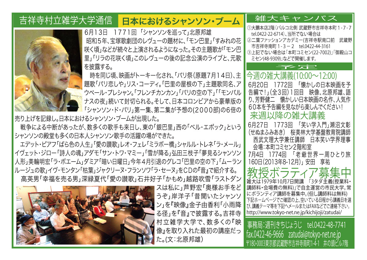 | 6月13日 1771回 | 6月13日(土) 「シャンソンを巡って」北原邦雄 シャンソンとはなんぞや、その歴史、青春時代を回顧しつつ名曲にひたっていただきます。 |