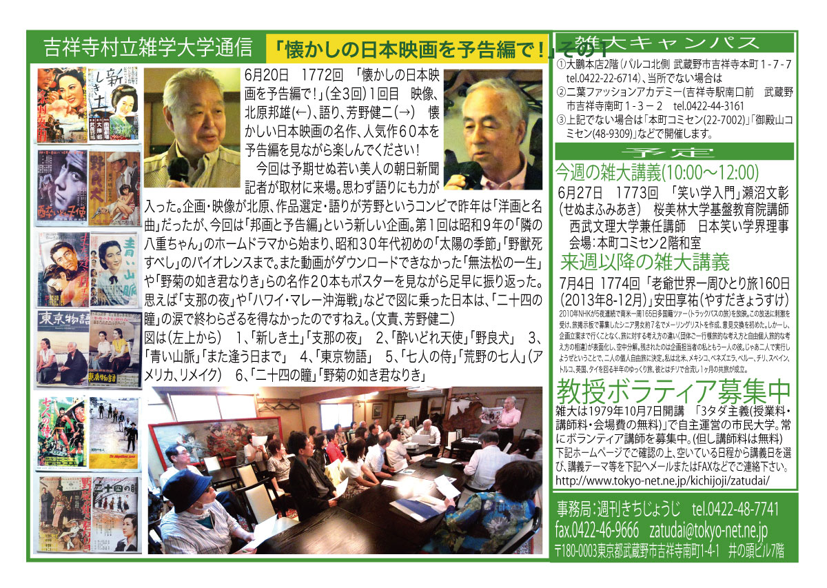 | 6月20日 1772回 | 6月20日「懐かしの日本映画を予告編で!」(全3回)1回目 映像、北原邦雄、語り、芳野健二 懐かしい日本映画の名作、人気作60本を予告編を見ながら楽しんでください! | |