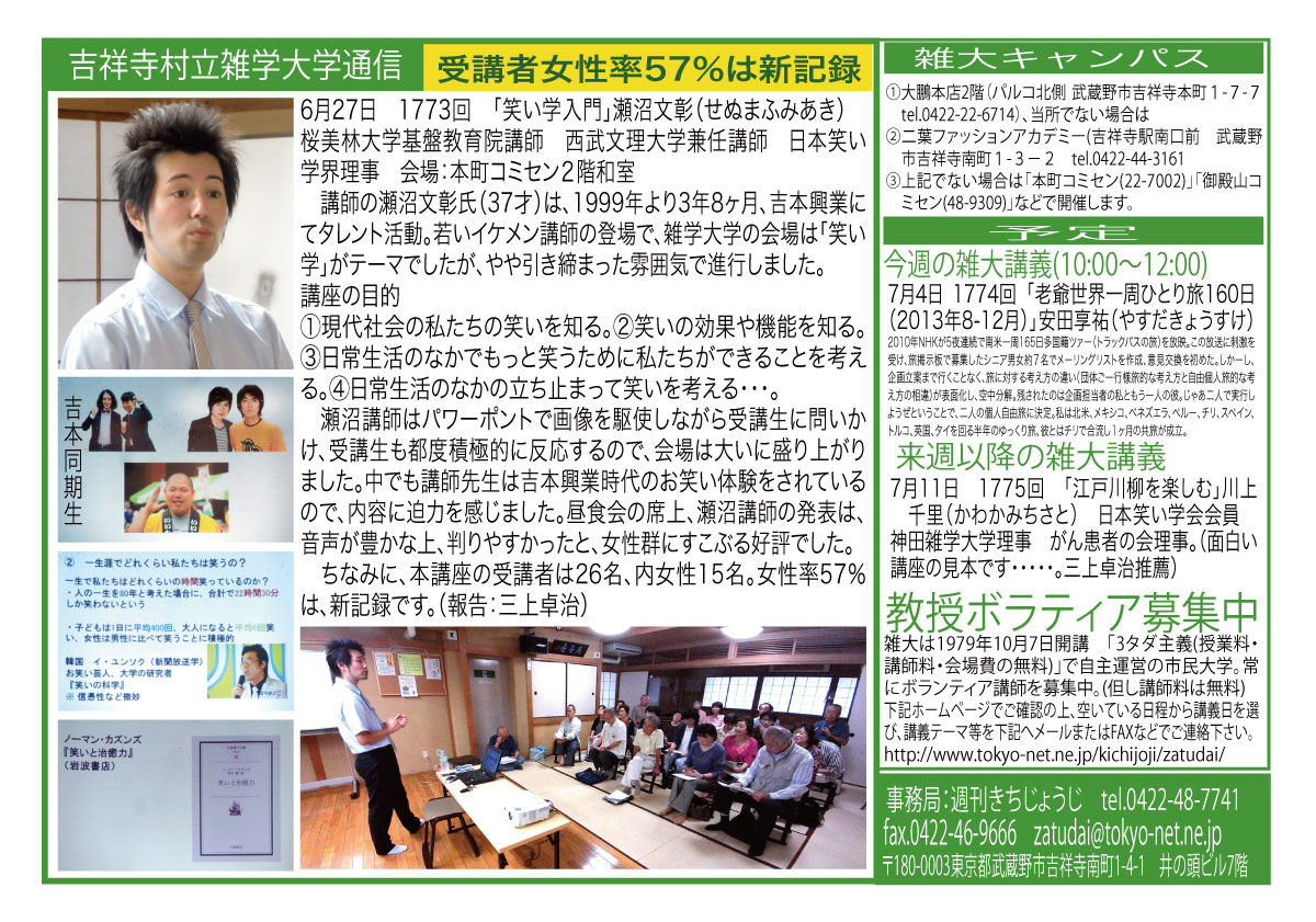 | 6月27日 1773回 | 6月27日「笑い学入門」瀬沼 文彰(せぬまふみあき) 桜美林大学基盤教育院講師 西武文理大学兼任講師 日本笑い学界理事 会場変更:本町コミセン2階 |