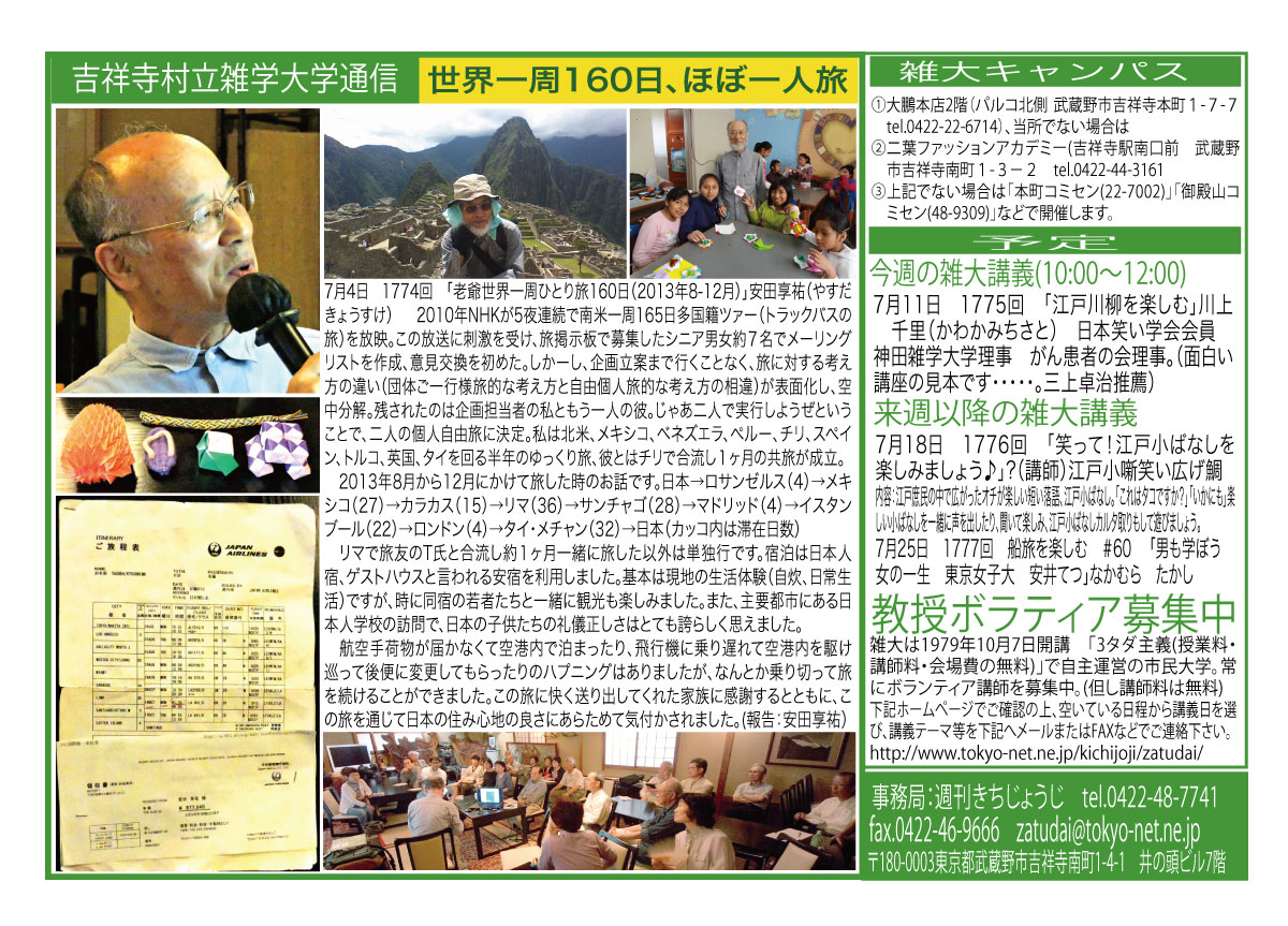 | 7月4日 1774回 | 「老爺世界一周ひとり旅160日(2013年8-12月)」 安田 享祐(やすだ きょうすけ) 2010年NHKが5夜連続で南米一周165日多国籍ツァー(トラックバスの旅)を放映。この放送に刺激を受け、旅掲示板で募集したシニア男女約7名でメーリングリストを作成、意見交換を初めた。しかーし、企画立案まで行くことなく、旅に対する考え方の違い(団体ご一行様旅的な考え方と自由個人旅的な考え方の相違)が表面化し、空中分解。残されたのは企画担当者の私ともう一人の彼。じゃあ二人で実行しようぜということで、二人の個人自由旅に決定。私は北米、メキシコ、ベネズエラ、ペルー、チリ、スペイン、トルコ、英国、タイを回る半年のゆっくり旅、彼とはチリで合流し1ヶ月の共旅が成立。 |