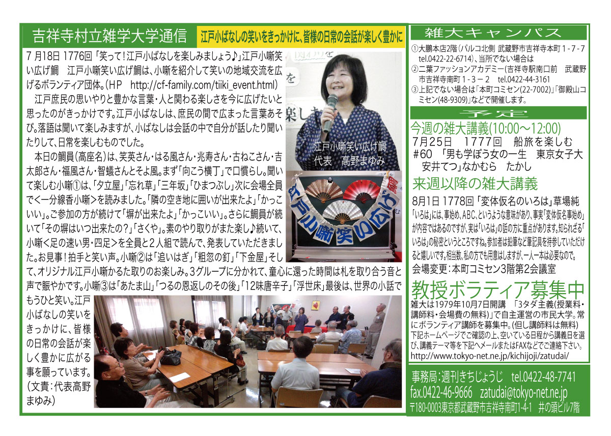 | 7月18日 1776回 | 7月18日 「笑って!江戸小ばなしを楽しみましょう♪」?(講師)江戸小噺笑い広げ鯛 内容:江戸庶民の中で広がったオチが楽しい短い落語、江戸小ばなし。「これはタコですか?」「いかにも」楽しい小ばなしを一緒に声を出したり、聞いて楽しみ、江戸小ばなしカルタ取りもして遊びましょう。 会場変更:御殿山コミセン1階会議室 | |